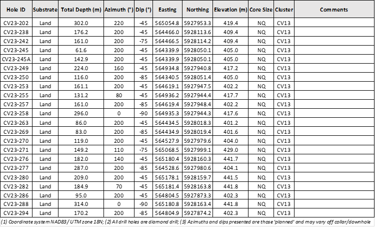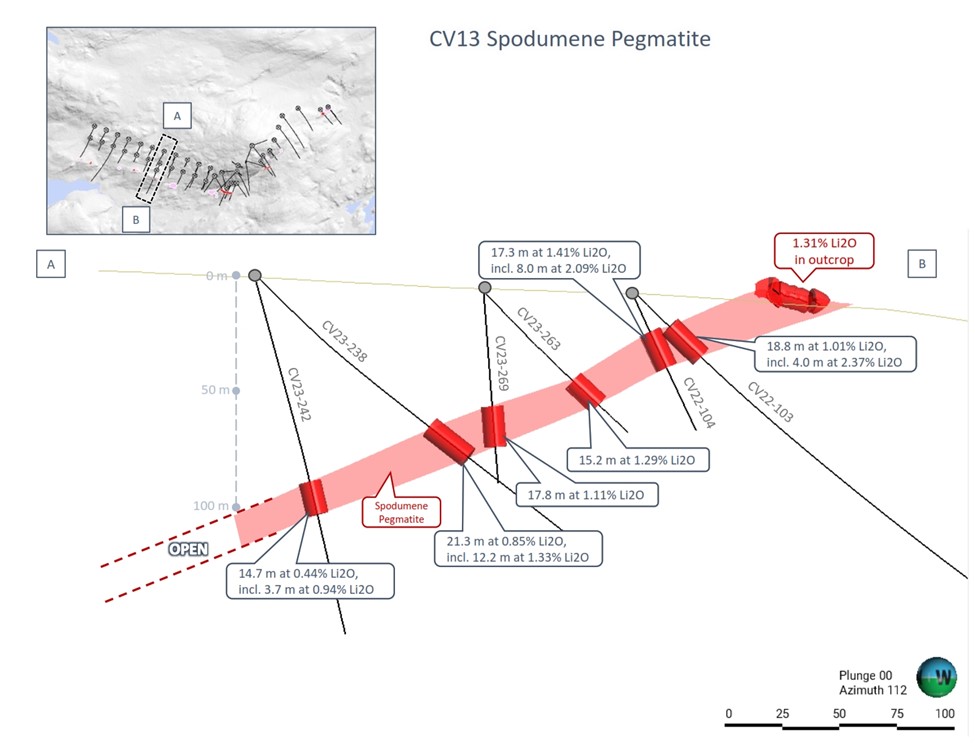 Additionally, the drill results reported herein have extended the previously identified higher-grade zone at the CV13 Spodumene Pegmatite (see news release dated October 18, 2023). Drill hole CV23-271 returned 10.6 m at 1.99% Li2O or 2.5 m at 5.28% Li2O within a wider interval of 15.7 m at 1.52% Li2O. This higher-grade zone now extends northeasterly along the eastern limb of the principal pegmatite for at least 200+ m, is present at shallow depth (typically within 40-50 m vertical depth) and remains open in several directions. Results of previously reported drill holes from this zone include 12.7 m at 2.46% Li2O (CV23-191), 8.0 m at 2.86% Li2O (CV23‑195), 10.2 m at 2.70% Li2O (CV23-198), 10.7 m at 2.79% Li2O (CV23‑200), 14.0 m at 2.14% Li2O (CV22‑092), and 7.0 m at 1.98% Li2O (CV22-095).