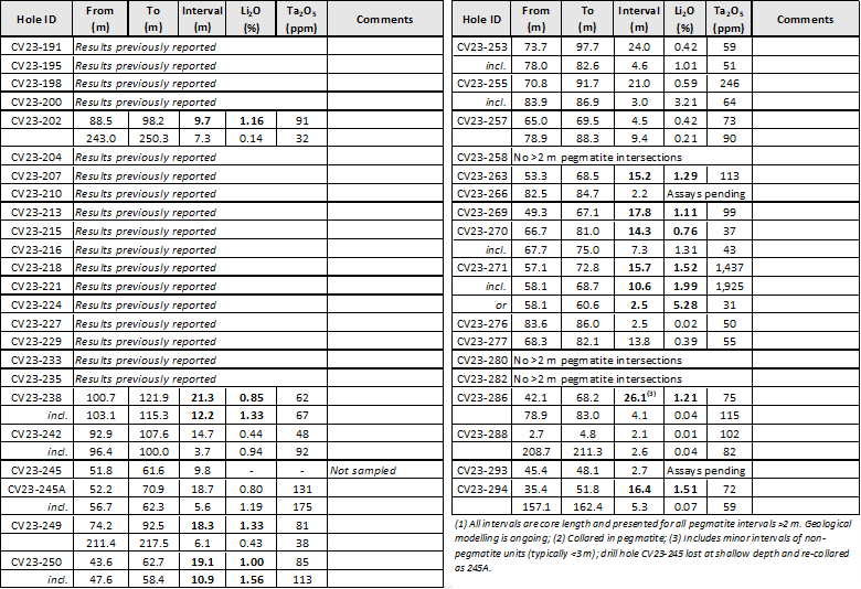 Core sample assays for drill holes reported herein are presented in Table 1 for all pegmatite intersections >2 m. Drill hole locations and attributes are presented in Table 2. For drill holes completed in 2023, results remain to be reported for the CV13 Pegmatite (35 holes), the CV5 Pegmatite (54 holes), and the CV9 Pegmatite (18 holes). The Company has completed processing of the drill core backlog from the 2023 program with the final samples to arrive on the lab shortly.