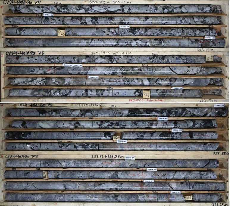 Figure 3 : Intersection de pegmatite à spodumène à haute teneur dans le sondage CV24-401A à CV5. La teneur des carottes de forage dans l’intervalle présenté (~320,7 m à 338,3 m) est de ~5,0 % Li2O.