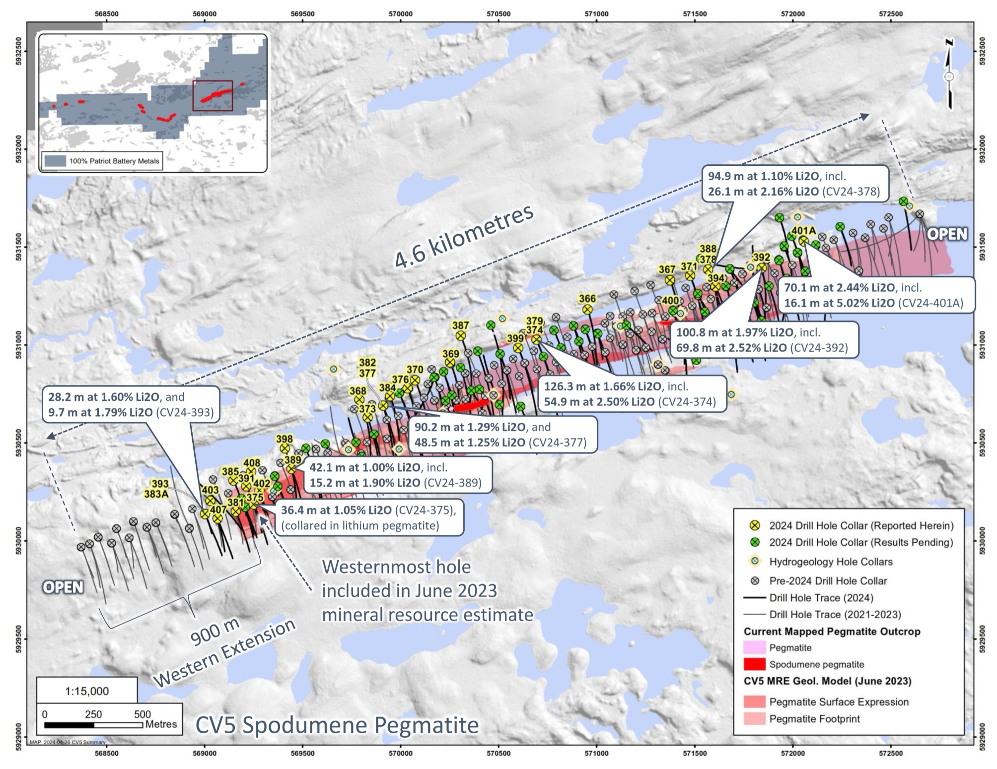 Métaux de Batteries Patriot inc. (la « Société » ou « Patriot ») (TSX : PMET) (ASX : PMT) (OTCQX : PMETF) (FSE : R9GA) a le plaisir d’annoncer des résultats d’analyse de carottes de forage pour des sondages forés en 2024 sur la pegmatite à spodumène CV5. La propriété Corvette (la « propriété » ou le « projet »), détenue à 100 % par la Société, est située dans la région d’Eeyou Istchee Baie-James au Québec. La pegmatite à spodumène CV5, où une première estimation de ressources minérales (« ERM ») fait état de 109,2 Mt à 1,42 % Li2O de ressources présumées1, est située à environ 13,5 km au sud de la route régionale Transtaïga praticable à l’année et du réseau de lignes électriques.