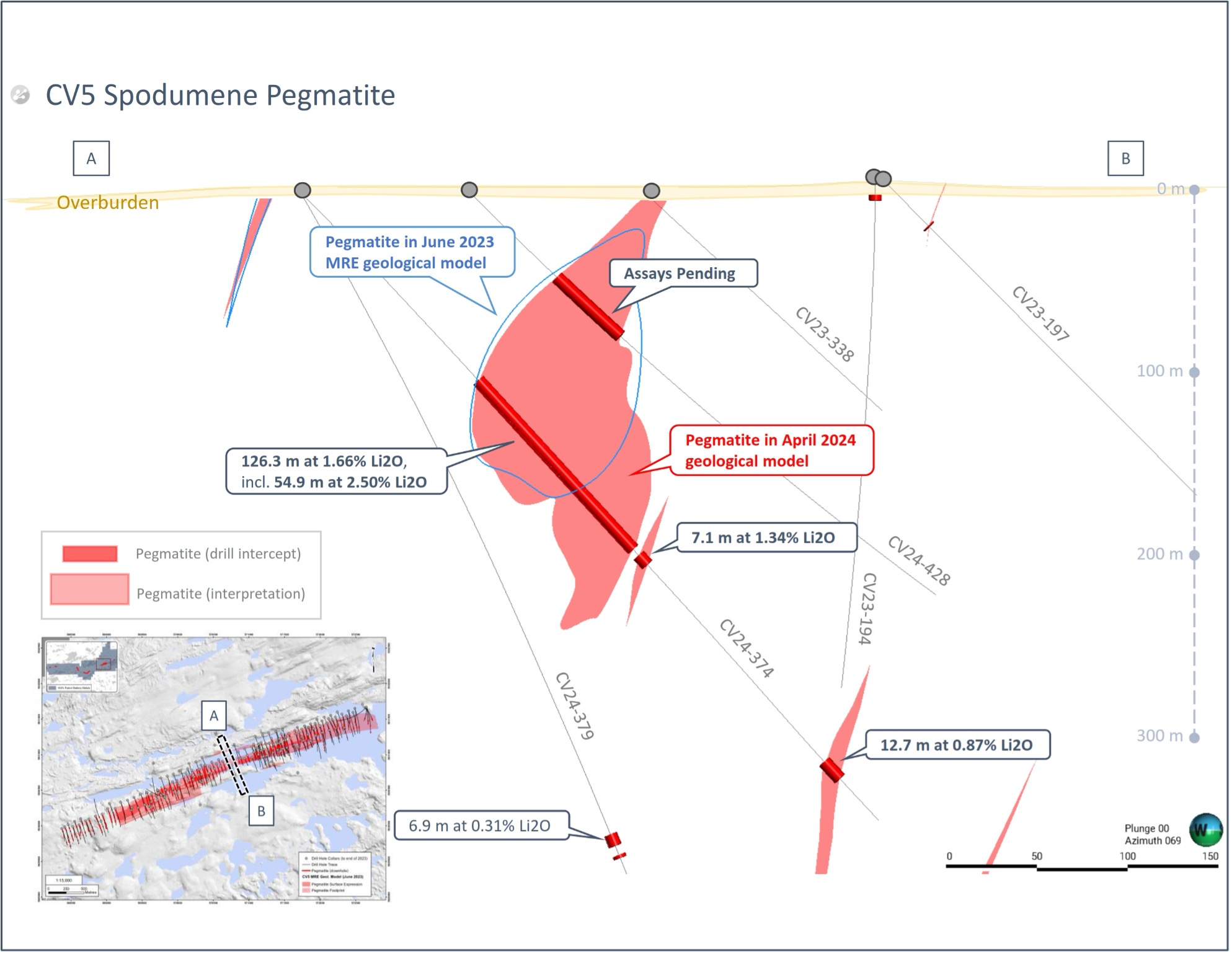 Collectivement, jusqu’à la fin d’avril 2024, les travaux de forage ont permis de suivre la pegmatite à spodumène CV5 sur une étendue latérale de 4,6 km, qui reste ouverte latéralement aux deux extrémités ainsi qu’en profondeur sur une proportion importante de sa longueur.