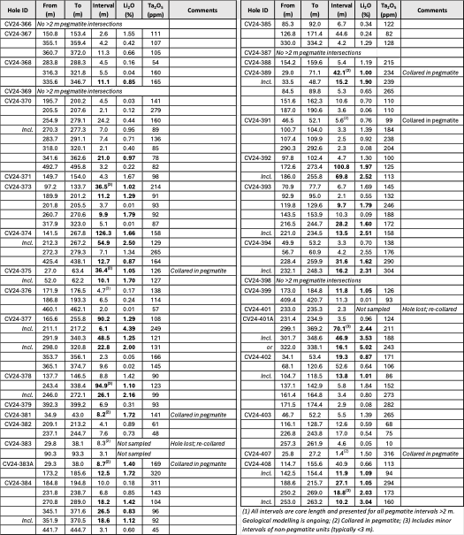 - 90,2 m à 1,29% Li2O et 48,5 m à 1,25 % Li2O (CV24-377).