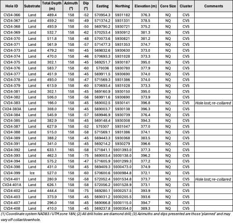 - Le programme de forage de l’hiver 2024 (maintenant terminé) a totalisé 62 518 m (166 sondages), incluant 50 961 m (121 sondages) à CV5 et 11 557 m (45 sondages) à CV13, dont 46 933 m (132 sondages) restent à publier.