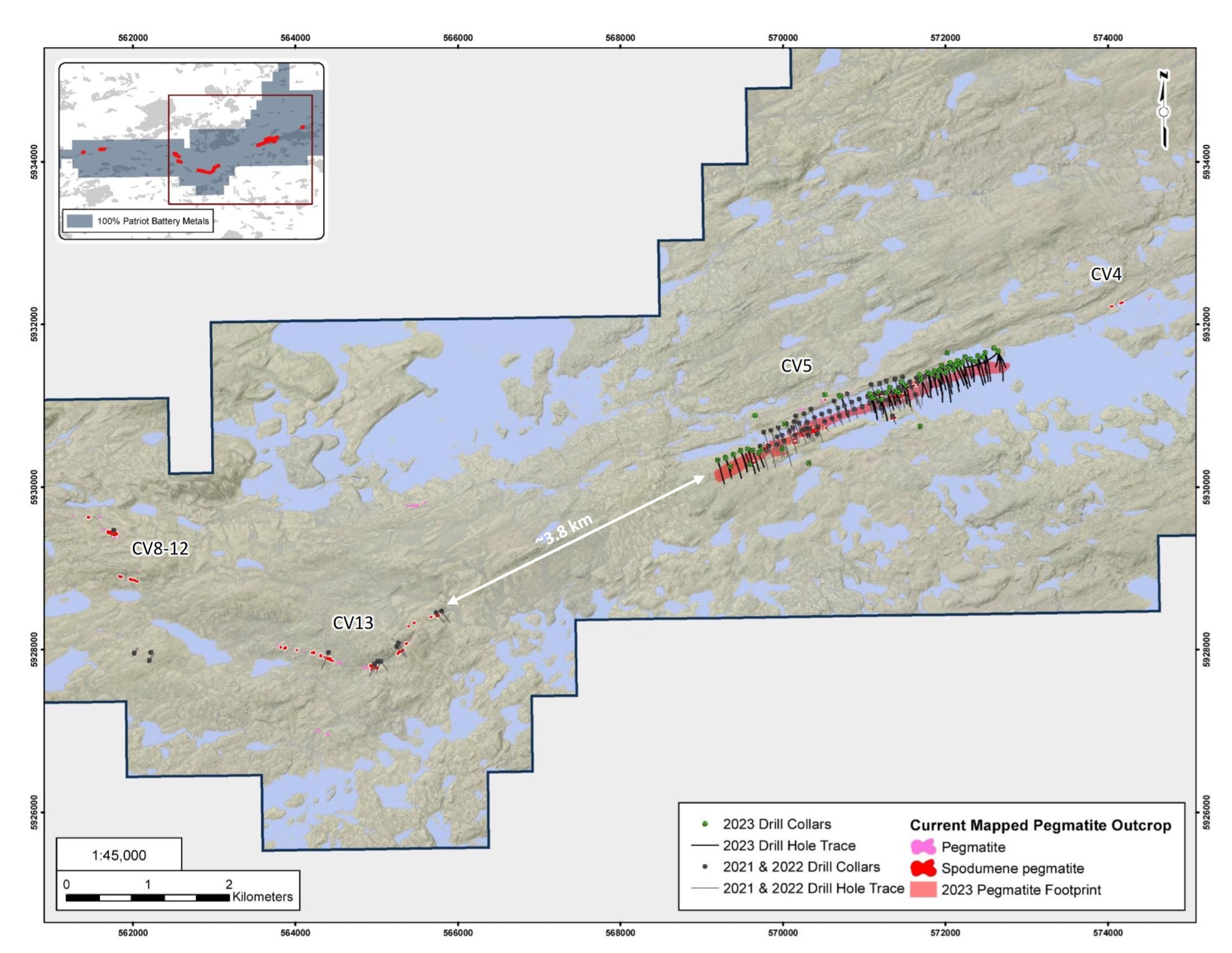 Patriot Battery Metals Inc. (the “Company” or “Patriot”) (TSX-V: PMET) (ASX: PMT) (OTCQX: PMETF) (FSE: R9GA) is pleased to announce the results of preliminary Heavy Liquid Separation (“HLS”) testwork on CV13 Pegmatite core samples. The CV13 Pegmatite cluster is located approximately 3.8 km along geological trend westwardly of the CV5 Pegmatite cluster (Figure 1), where drilling has defined a large and continuous spodumene mineralized body (see news release dated June 14, 2023).