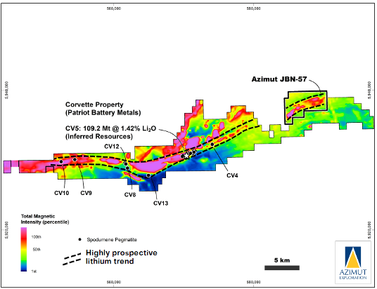 Métaux de Batteries Patriot inc. (la « Société » ou « Patriot ») (TSX : PMET) (ASX : PMT) (OTCQX : PMETF) (FSE : R9GA) a le plaisir d’annoncer la signature d’une entente définitive visant à agrandir sa position de terrain sur sa propriété Corvette en procédant à l’acquisition, auprès d’Exploration Azimut inc. (« Azimut ») (TSX-V : AZM) (OTCQX : AZMTF), d’une participation de 100 % dans un bloc de claims proximal nommé JBN-57 (le « bloc de claims »), constitué de 39 claims (1 995,0 ha) situés dans la continuité latérale de la propriété Corvette (l’« acquisition »). La propriété Corvette, détenue à 100 % par la Société, est située dans la région d’Eeyou Istchee Baie-James au Québec. La pegmatite à spodumène CV5, où une première estimation de ressources minérales (« ERM ») fait état de 109,2 Mt à 1,42 % Li2O de ressources présumées1, est située à environ 13,5 km au sud de la route régionale Transtaïga praticable à l’année et du réseau de lignes électriques.