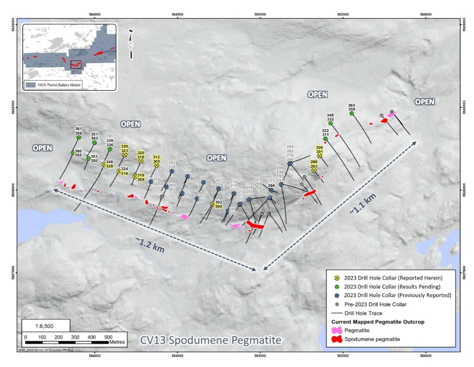 Métaux de Batteries Patriot inc. (la « Société » ou « Patriot ») (TSX : PMET) (ASX : PMT) (OTCQX : PMETF) (FSE : R9GA) a le plaisir d’annoncer de nouveaux résultats de forage issus du programme de 2023 ciblant la pegmatite à spodumène CV13, ainsi que le récent développement d’infrastructures visant à soutenir le programme de forage de 2024 en cours sur la propriété Corvette. La propriété Corvette (la « propriété » ou le « projet »), détenue à 100 % par la Société, est située dans la région d’Eeyou Istchee Baie-James au Québec. La pegmatite à spodumène CV13 est située environ 3 km à l’ouest-sud-ouest de la pegmatite à spodumène CV5, où une première estimation de ressources minérales fait état de 109,2 Mt à 1,42 % Li2O de ressources présumées1 et qui est située à environ 13,5 km au sud de la route régionale Transtaïga praticable à l’année et du réseau de lignes électriques.