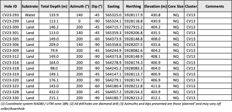 Des résultats sont aussi publiés aujourd’hui pour un (1) sondage foré en 2023 (CV23-300, indiqué ci-dessous) dans la zone apicale de la structure encaissante régionale à CV13. Les résultats d’un (1) sondage (CV23‑302) foré en 2023 dans ce secteur restent à venir (figure 1).