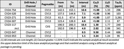 - 10,6 m à >1,00 % Cs2O (CV24-754) à CV13 – En attente des résultats de la réanalyse du Cs avec limite de détection plus élevée [1].