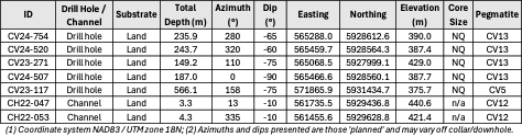 - 10,6 m à >1,00 % Cs2O (CV24-754) à CV13 – En attente des résultats de la réanalyse du Cs avec limite de détection plus élevée.