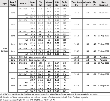 • 1.65% Li2O and 193 ppm Ta2O5 over 159.7 m (from 131.8 m downhole), including 4.12% Li2O and 162 ppm Ta2O5 over 9.0 m(CV22-042)