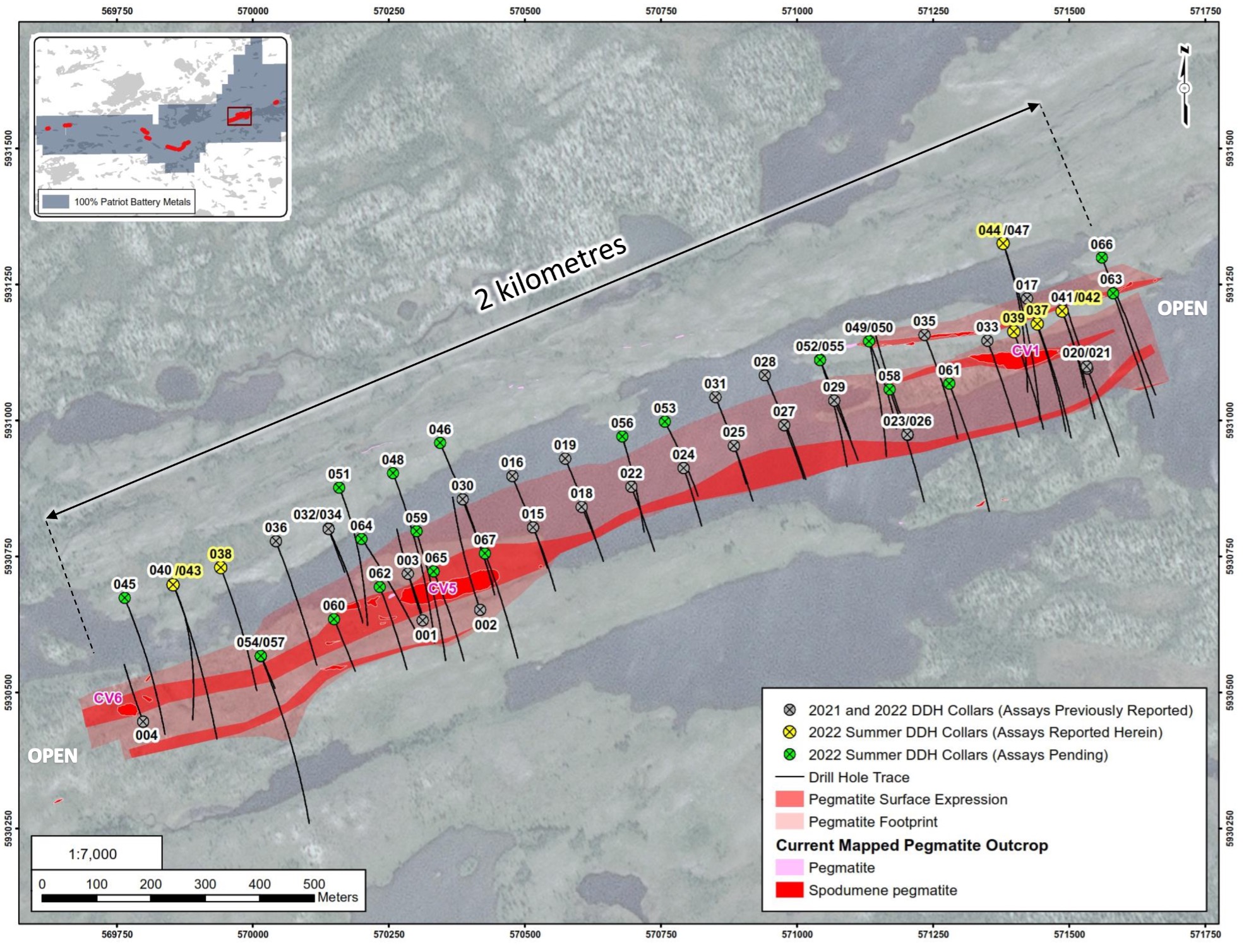 Patriot Battery Metals Inc. (the “Company” or “Patriot”) (TSX-V: PMET) (OTCQB: PMETF) (FSE: R9GA) is pleased to announce core assay results for an additional six (6) drill holes (CV22-037, 038, 039, 042, 043, and 044) completed as part of the summer phase of the 2022 drill campaign at its wholly owned Corvette Property (the “Property”), located in the James Bay Region of Quebec. The target drill area – at the CV Lithium Trend – is located approximately 13.5 km south of the regional and all-weather Trans-Taiga Road and powerline infrastructure.