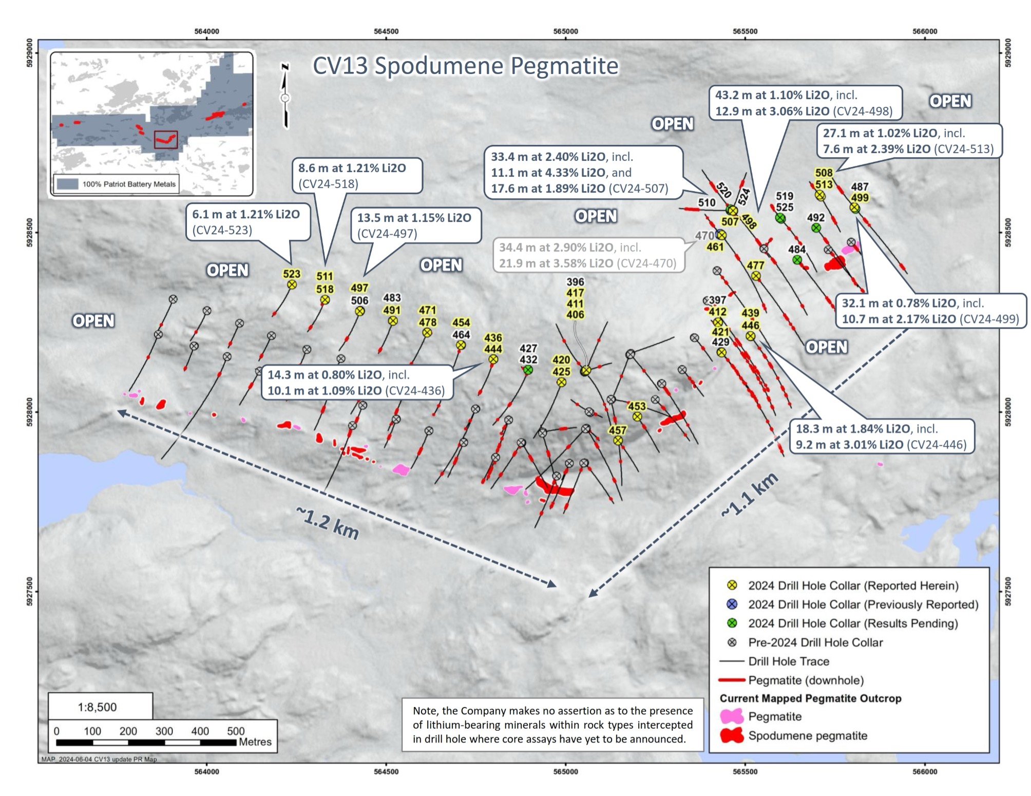 - 43,2 m à 1,10 % Li2O, incluant 12,9 m à 3,06 % Li2O (CV24-498).