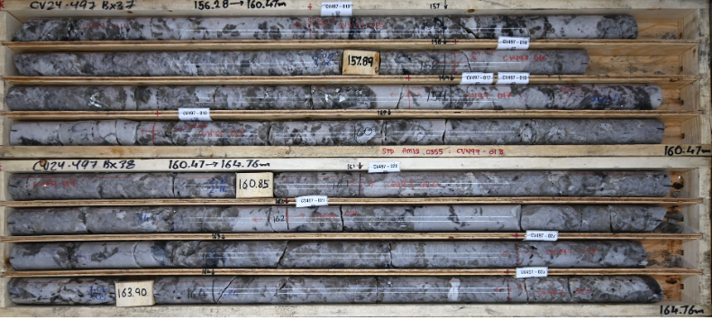Figure 7 : Intersection de pegmatite à spodumène dans le sondage CV24‑497 à CV13, dont la teneur moyenne est d’environ 1,3 % Li2O sur l’intervalle présenté (156,3 m à 164,8 m).