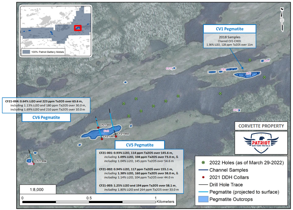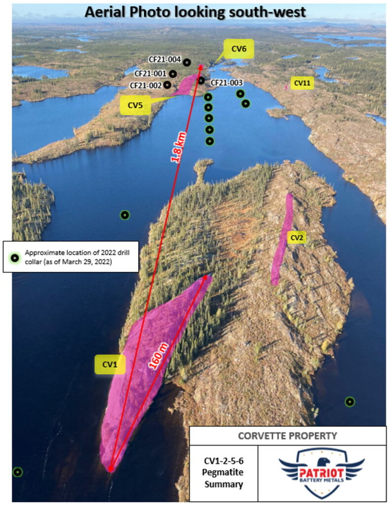 Vancouver, BC, Canada – Patriot Battery Metals Inc. (the “Company” or “Patriot”) (CSE: PMET) (OTCQB: PMETF) (FSE: R9GA) is pleased to provide a further update on the winter/spring component of its 2022 drill campaign program at its wholly owned Corvette Property (the “Property”), located in the James Bay Region of Quebec. The target drill area – at the CV Lithium Trend – is located approximately 13.5 km south of the regional and all-weather Trans-Taiga Road and powerline infrastructure.