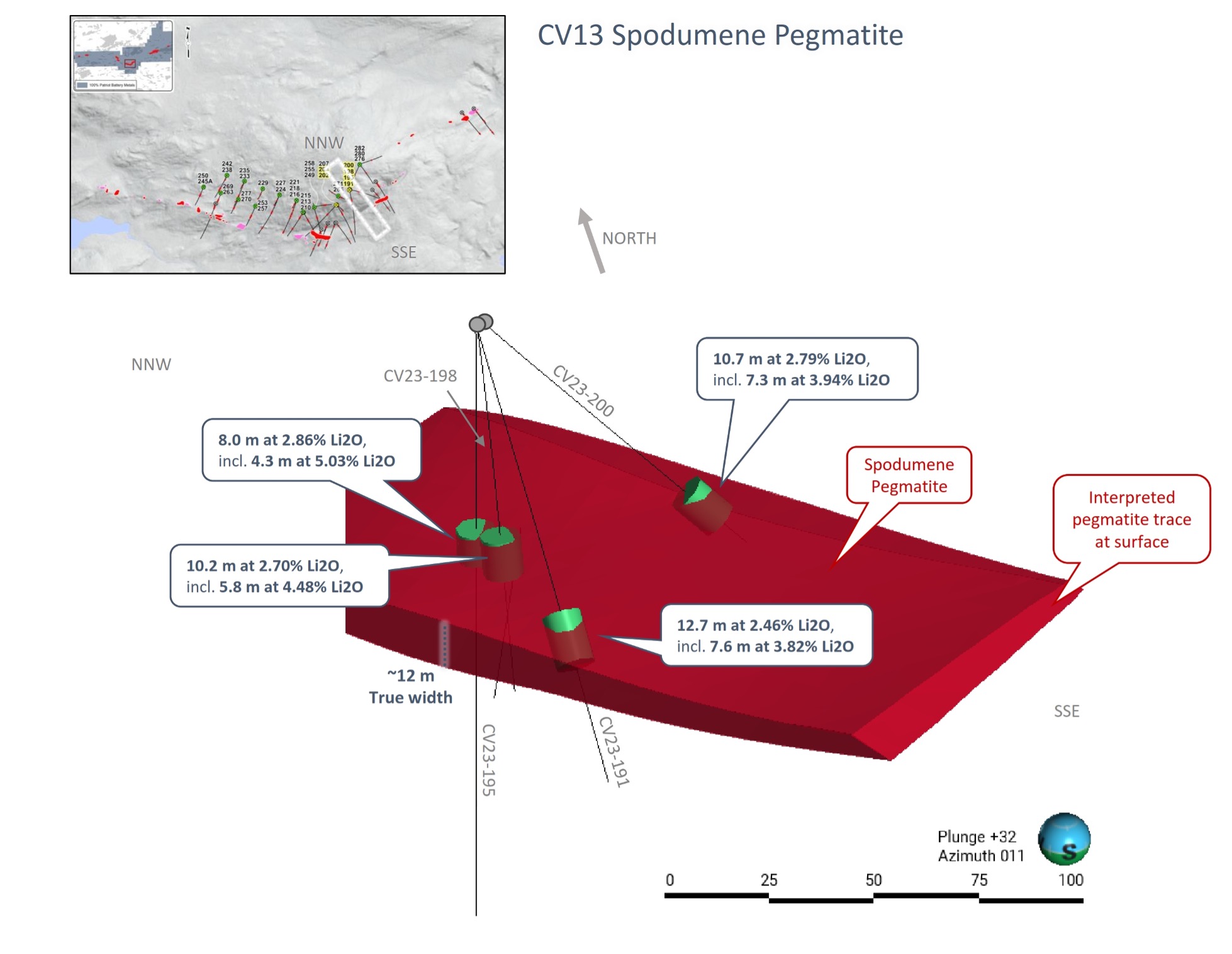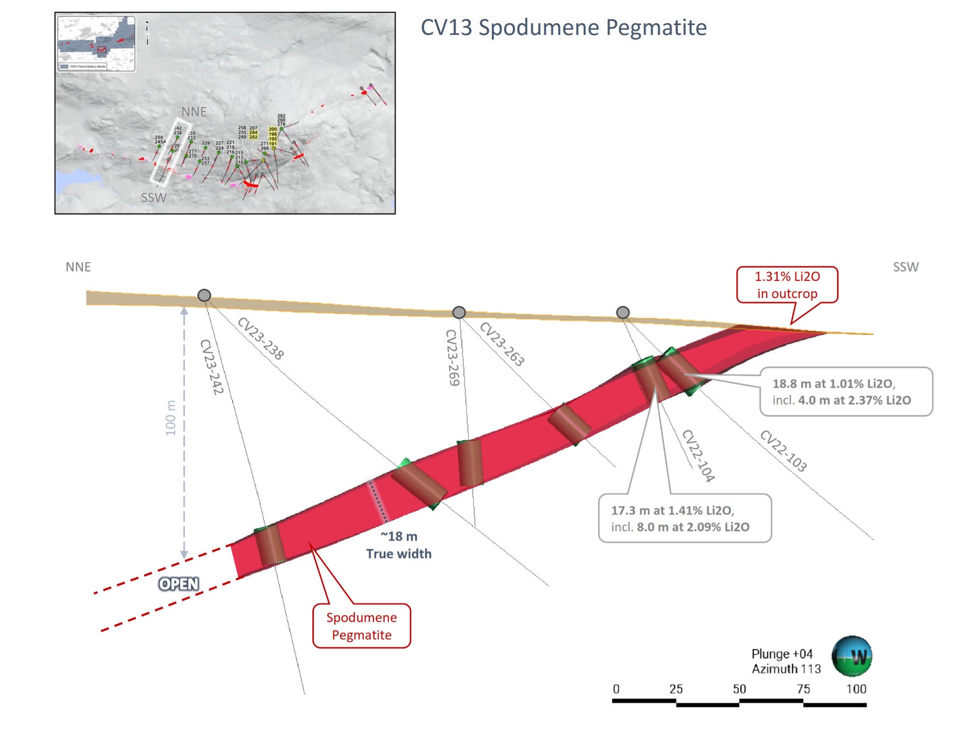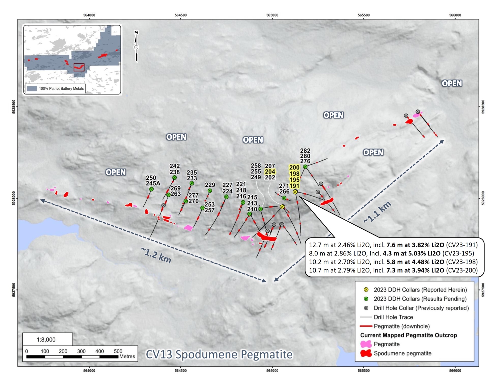 Patriot Battery Metals Inc. (the “Company” or “Patriot”) (TSX-V: PMET) (ASX: PMT) (OTCQX: PMETF) (FSE: R9GA) is pleased to announce core assays for the first series of drill holes completed at the CV13 Spodumene Pegmatite as part of the ongoing 2023 summer-fall drill program being completed at its wholly owned Corvette Property (the “Property” or “Project”), located in the Eeyou Istchee James Bay region of Quebec. At the Property, the CV13 Spodumene Pegmatite is located approximately 3.15 km along strike to the southwest of the CV5 Spodumene Pegmatite. The CV5 Spodumene Pegmatite, with a maiden mineral resource estimate of 109.2 Mt at 1.42% Li2Oinferred1, is situated approximately 13.5 km south of the regional and all‑weather Trans-Taiga Road and powerline infrastructure.