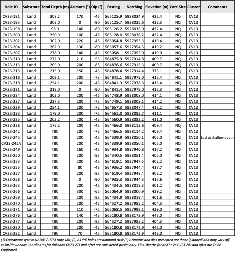 · Additional rig now coring for a total of eight (8) drill rigs currently active at site – four (4) at CV5, three (3) at CV13, and one (1) at CV9. Drilling is anticipated to ramp up further after the holidays with ten (10) drill rigs anticipated by mid January 2024.