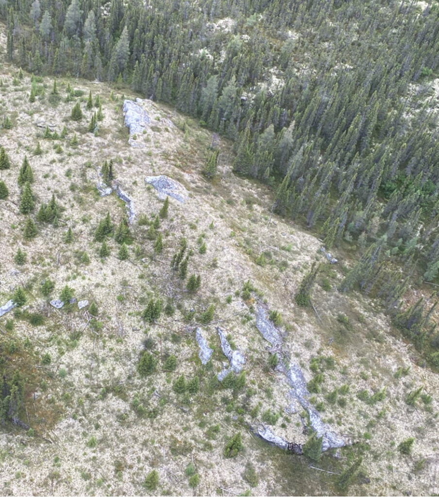Figure 2: Two of the larger lithium pegmatite outcrops in the CV13 cluster, located at the apex of a regional structural flexure