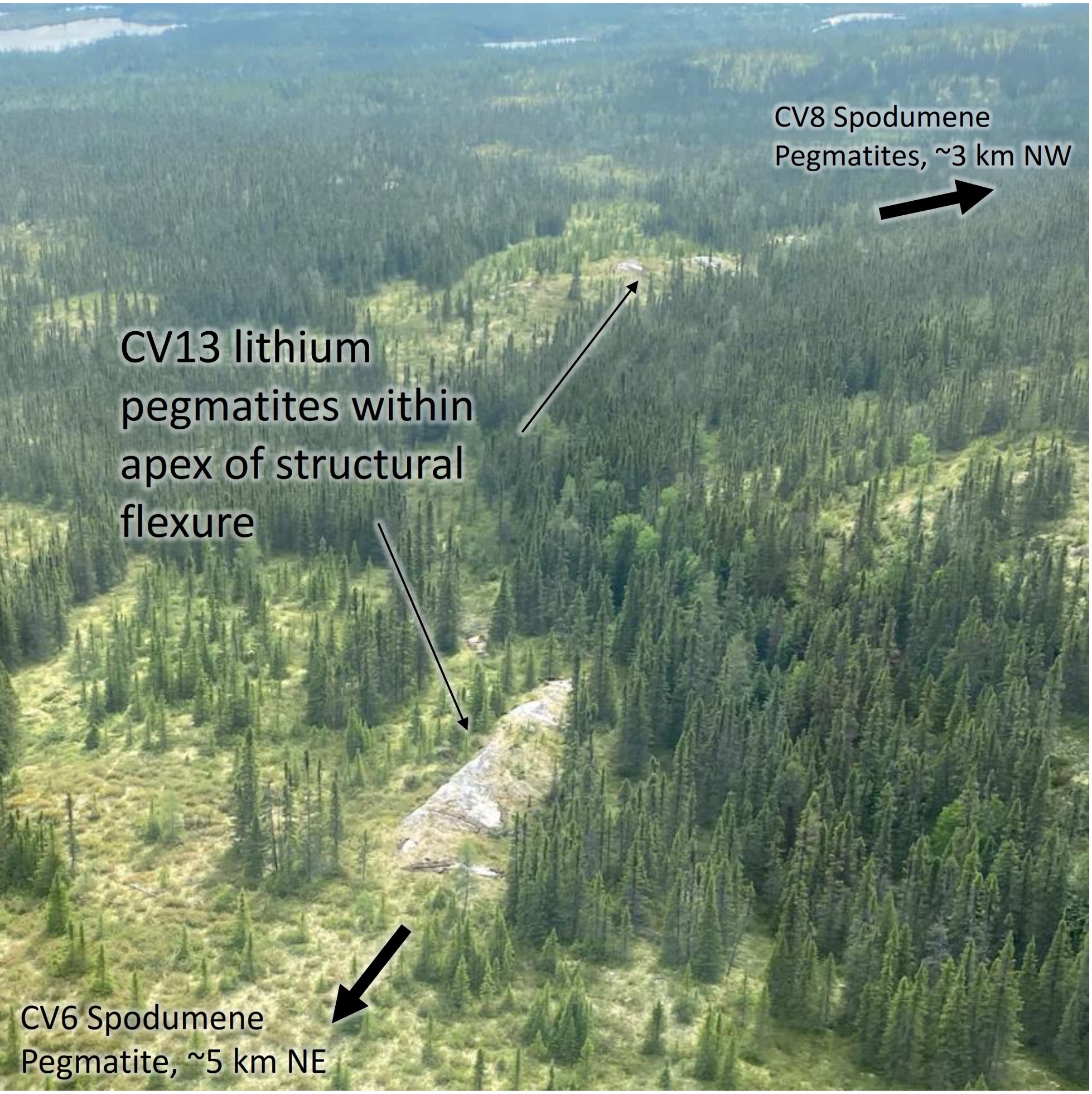 The location of this new lithium pegmatite discovery is very significant and is situated within the central portions of the prospective CV Lithium Trend, which extends across the Property. Specifically, the CV13 pegmatites are situated only ~4.3 km along trend of the CV5-1 lithium pegmatite corridor and ~1.9 km along trend of the CV8 pegmatites. The areas between have very poor outcrop exposure due to glacial till cover and therefore it is possible that additional lithium pegmatite may be present under the shallow cover. Additionally, the CV13 pegmatites are situated within the apex of a regional geological flexure as is evidenced in the regional mapping and magnetic surveys. This local geological setting is a prime area of interest along the CV Lithium Trend as it hosts a highly favourable environment for lithium pegmatite emplacement (along strike and to depth), with a strong potential for dilational zones which may increase widths of mineralization.
