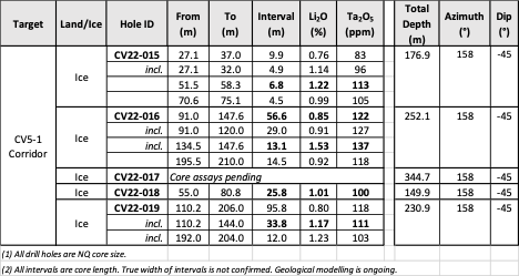 Assays are announced herein for drill holes CV22-015, 016, 018, and 019, which were designed to test the northeastern and down-dip extension of the lithium-tantalum mineralized zone at the CV5 Pegmatite. All four holes were collared over lake ice at an orientation of 158°/45°, with end-of-hole depths ranging from 149.9 m to 252.1 m, and each returning strong grades of lithium and tantalum. A summary of lithium (and tantalum) intercepts for the four (4) drill holes (CV22‑15, 016, 018, and 019) are presented in Table 1 and Figure 2, and core photos of mineralized intercepts in Figures 3, 4, and 5. Drill hole locations for holes completed as part of the winter program are in Figure 1.