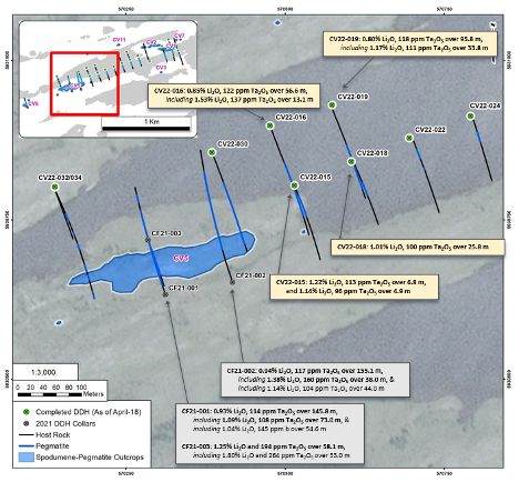 As reported herein, lithium mineralization has been traced by drilling over at least a 900 m strike length and down dip to at least 155 m vertical depth. To date, drill core sample analytical results have been reported for four (4) drill holes (CV22-015, 016, 018, and 019) with results pending for an additional sixteen (16) drill holes completed over the winter/spring program (4,345 m over 20 drill holes). The Company is using SGS Canada (Lakefield, ON, and Burnaby, BC, facilities) as their primary analytical lab with all samples from the program having arrived at the lab.