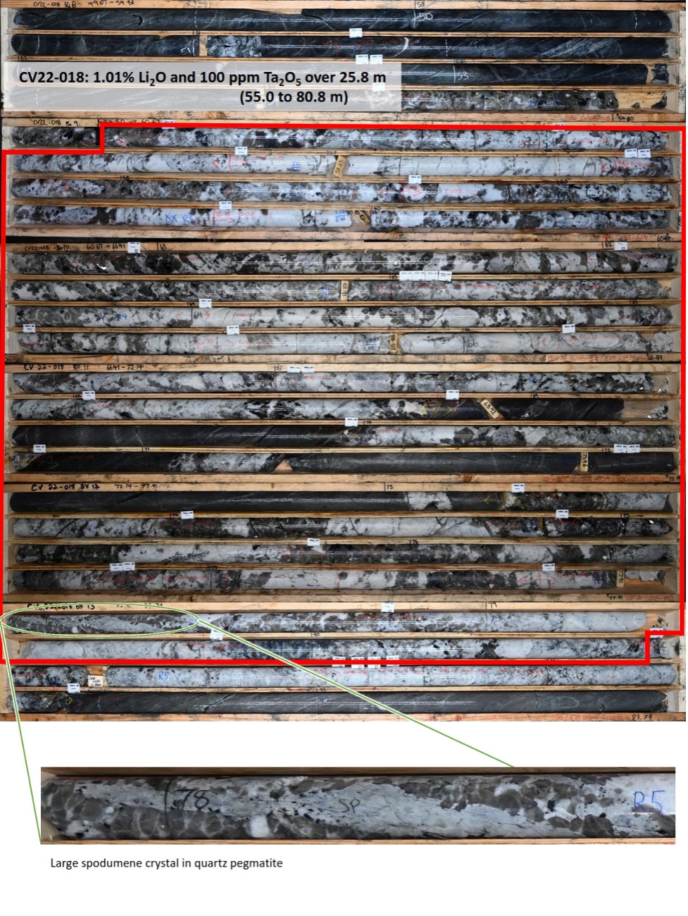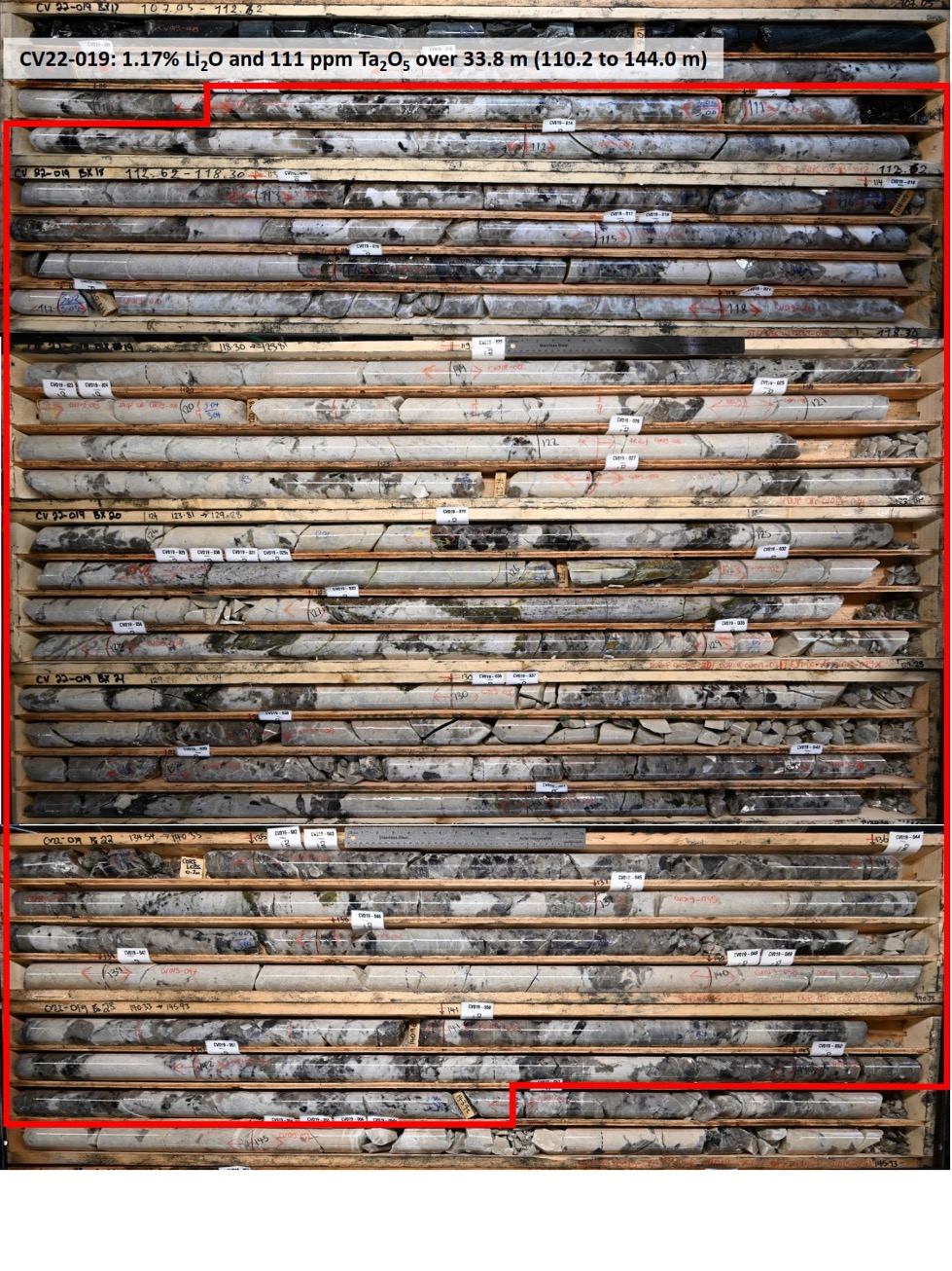 - 1.17% Li2O and 111 ppm Ta2O5 over 33.8 m within a wider zone of 0.80% Li2O and 118 ppm Ta2O5 over 95.8 m (CV22-019)