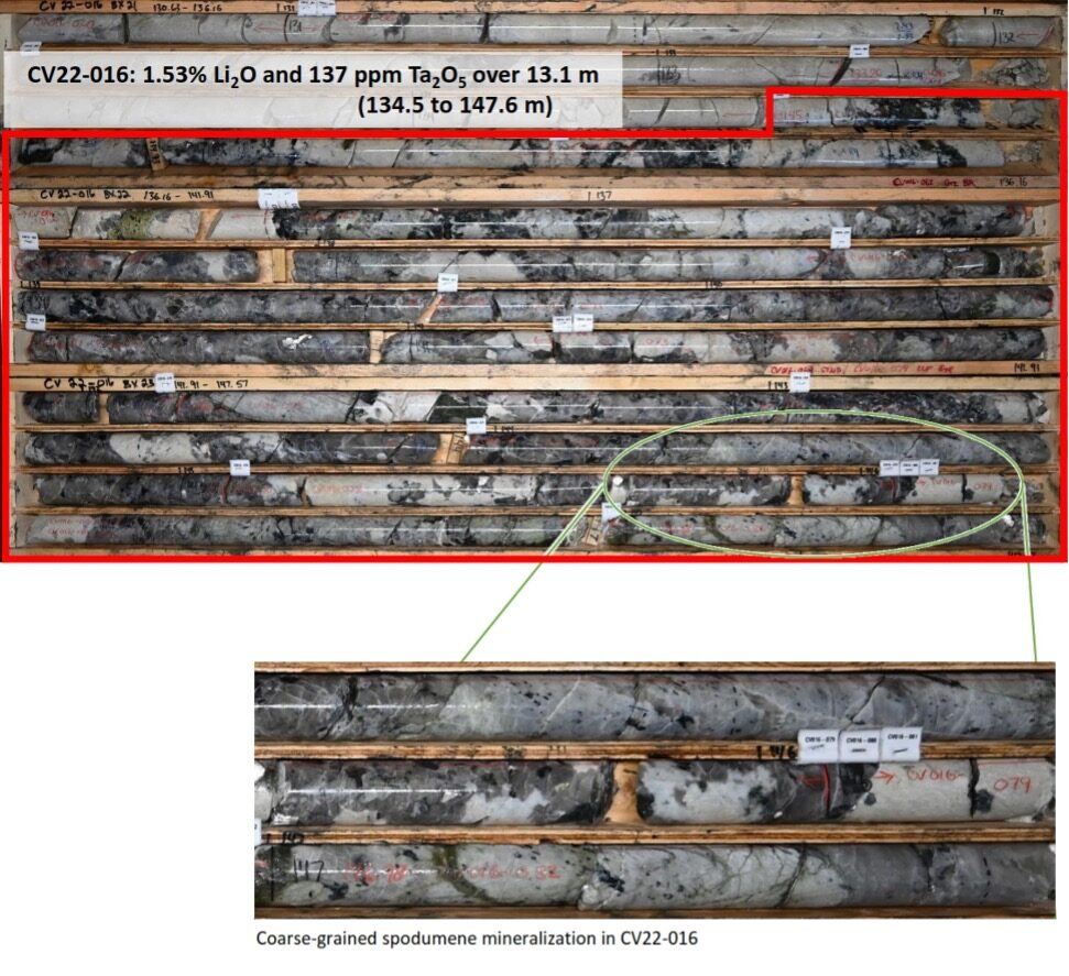 - Strong lithium and tantalum mineralization confirmed in first series of core sample assays received for drill holes CV22-015, 016, 018, and 019, including