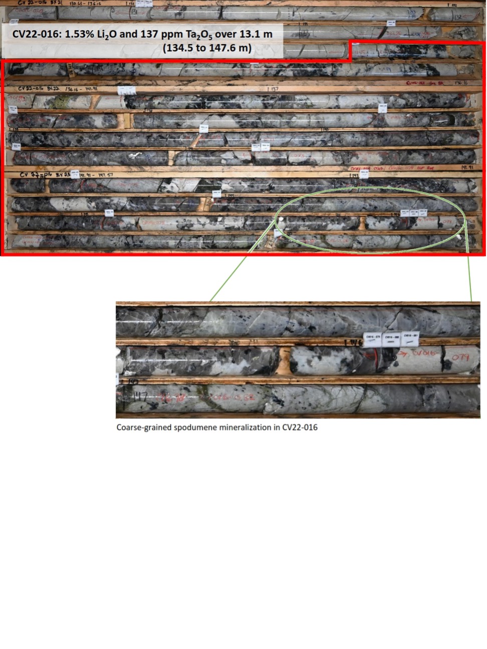 - 0.91% Li2O and 127 ppm Ta2O5 over 29.0 m within a wider zone of 0.85% Li2O and 122 ppm Ta2O5 over 56.6 m; and a separate zone of 1.53% Li2O and 137 ppm Ta2O5 over 13.1 m (CV22‑016)