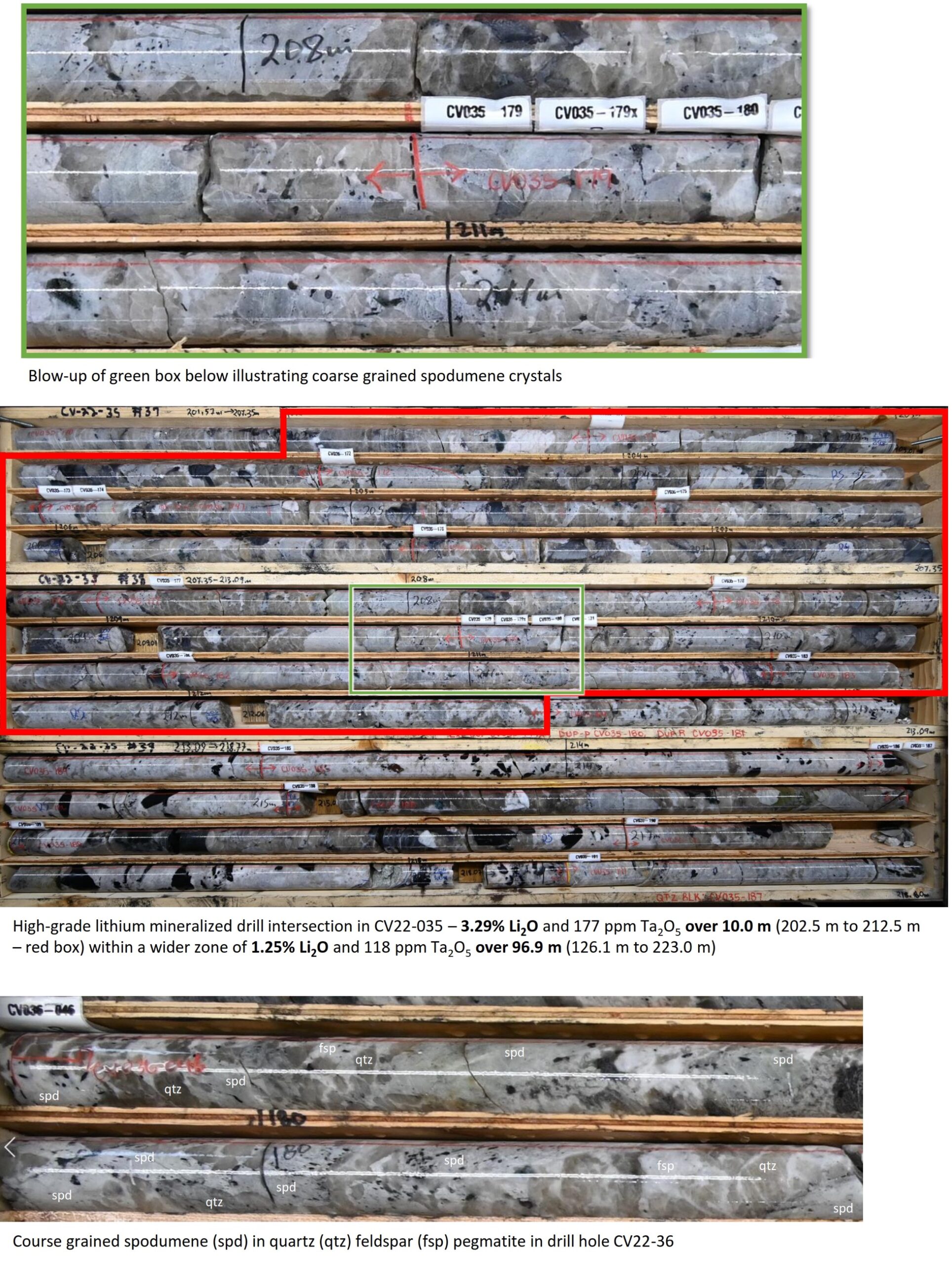 - 1.25% Li2O and 118 ppm Ta2O5 over 96.9 m, including 2.53% Li2O and 130 ppm Ta2O5 over 27.0 m (CV22-035)