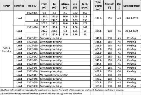 To date, a total of 10,355 m (36 holes) have now been completed over the 2022 drill campaign, including 6,010 m (16 holes) as part of the summer program – drill holes CV22-035 through 050. Core assay results are announced herein for the first two (2) drill holes of the summer program (CV22-035 and 036). Results include well-mineralized intercepts of 1.25% Li2O and 118 ppm Ta2O5 over 96.9 m, including 2.53% Li2O and 130 ppm Ta2O5 over 27.0 m (CV22-035), and 1.38% Li2O and 99 ppm Ta2O5 over 27.0 m, and 2.00% Li2O and 167 ppm Ta2O5 over 7.3 m (CV22-036).