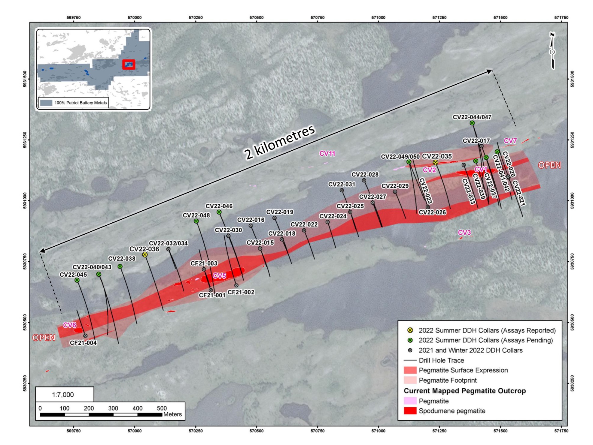 Drill hole CV22-035 was collared approximately 200 m along strike to the west-southwest of drill hole CV22-017 (2.22% Li2O over 70.1 m – see news released dated May 24th, 2022) and targeted the main pegmatite body at depth (Figure 1). The hole returned a wide intercept of mineralized pegmatite assaying 1.25% Li2O and 118 ppm Ta2O5 over 96.9 m, including 2.53% Li2O and 130 ppm Ta2O5 over 27.0 m. The interval included three (3) individual 1-m samples over 4% Li2O including a peak of 5.38% Li2O. The drill hole also collared in mineralized pegmatite (CV2 outcrop) assaying 0.62% Li2O and 155 Ta2O5 over 2.5 m. The CV2 Pegmatite is interpreted to be a relatively narrow (<5 m wide), mineralized pegmatite dyke trending sub-parallel to the main body (Figure 1). The CV2 Pegmatite has not been significantly drill tested and is interpreted to continue eastwardly towards the CV7 outcrop, potentially forming a single continuous body sub-surface.