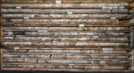 Figure 2: Well mineralized drill core from the principal pegmatite body (CV5) – drill hole CV22-040 at 221.4 m to 238.7 m depth