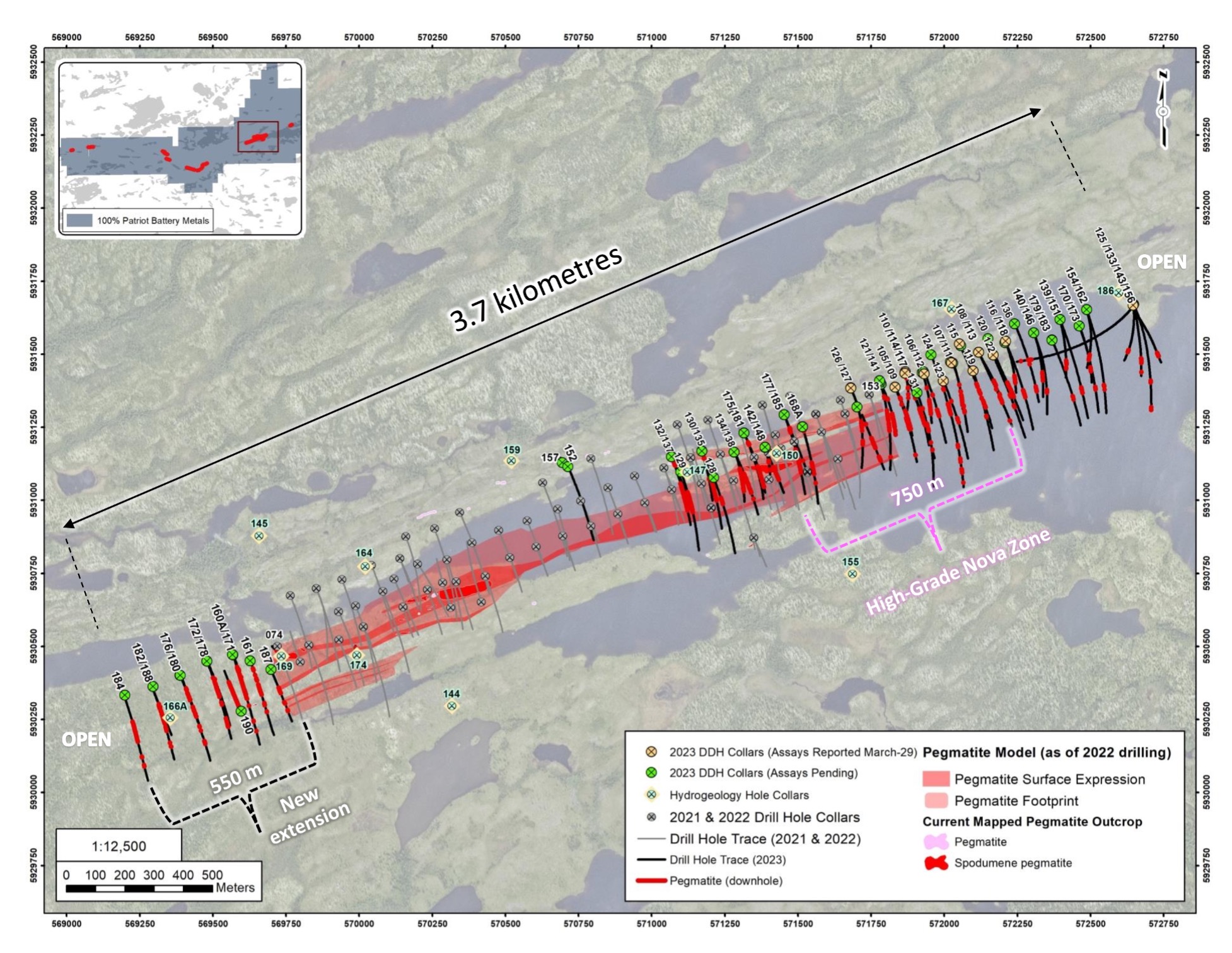 Patriot Battery Metals Inc. (the “Company” or “Patriot”) (TSX-V: PMET) (ASX: PMT) (OTCQX: PMETF) (FSE: R9GA) is pleased to provide an update on the 2023 winter drill program recently completed at its wholly owned Corvette Property (the “Property”), located in the Eeyou Istchee James Bay region of Quebec. The winter phase of the 2023 drill campaign was focused on the CV5 Pegmatite, located approximately 13.5 km south of the regional and all‑weather Trans-Taiga Road and powerline infrastructure.