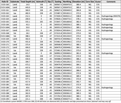 The 2023 winter drill program recently concluded with a total of eighty-nine (89) drill holes and 32,367 m completed – drill holes CV23-105 through 190 (Table 1). This drilling focused on step-out and infill drilling at the CV5 Pegmatite (NQ core size); however, also included fifteen (15) holes (2,311 m) to support hydrogeological modelling of the envisioned pit area at CV5 as well as three (3) holes (615 m) at the site of the pending camp at KM270 of the Trans-Taiga Road (NQ and HQ core size).