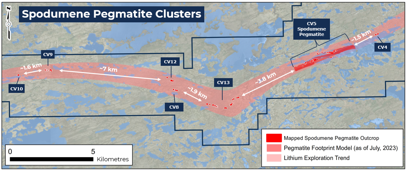 The 2023 summer-fall exploration includes both a drill and surface exploration program, which commenced at the Property in late May. A total of four (4) drill rigs are currently active on site with additional drill rigs planned to arrive on site and commence operations shortly. The multi-rig drill program is currently focused on further delineation of the CV5 and CV13 pegmatites and is anticipated to expand this fall to include drill testing at the CV8, CV12, and CV9 spodumene pegmatite clusters (Figure 1). Surface exploration has also resumed and includes prospecting and rock sampling across a large portion of the remaining 20+ km of prospective lithium pegmatite trend.