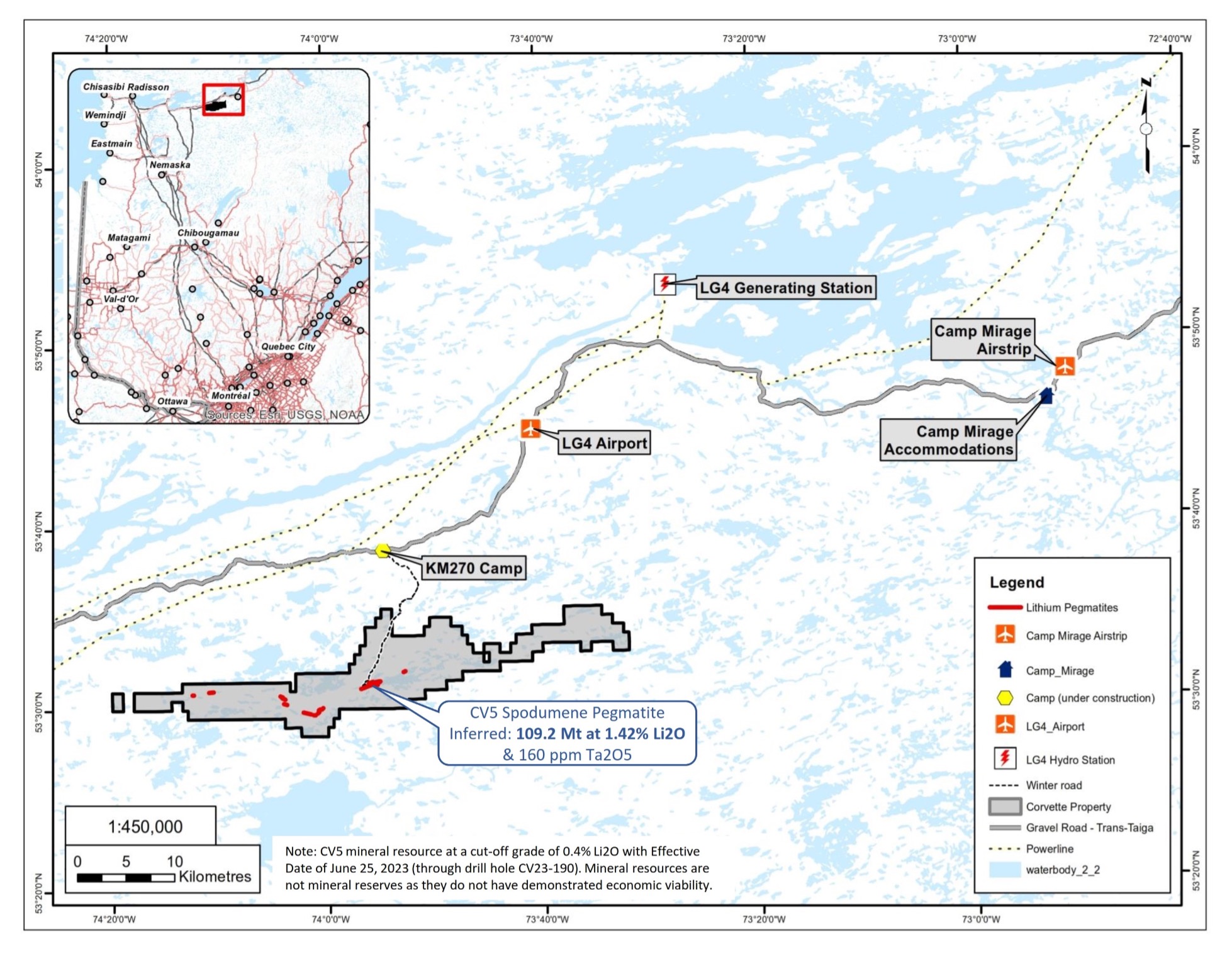 Patriot Battery Metals Inc. (the “Company” or “Patriot”) (TSX-V: PMET | ASX: PMT | OTCQX: PMETF | FSE: R9GA) is pleased to provide an operations update on the mineral exploration and development of its Corvette Property (the “Property”), host to the CV5 Spodumene Pegmatite. The CV5 Spodumene Pegmatite, the 8th largest lithium pegmatite in the world, is located approximately 13.5 km south of the regional and all‑weather Trans-Taiga Road and powerline infrastructure corridor, and within 50 km of the La-Grande 4 (LG4) hydroelectric dam complex.