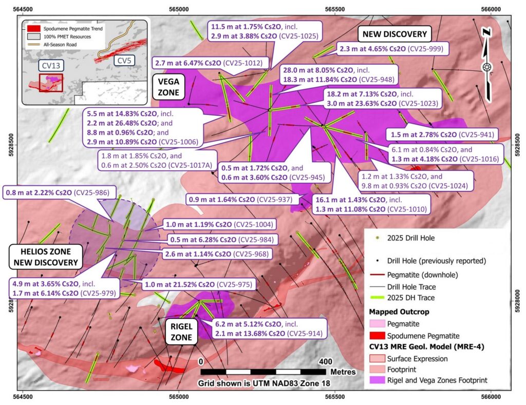 À CV13, les travaux d’exploration et de mise en valeur des ressources se poursuivront dans le cadre de la campagne de forage proposée par la Société pour 2026, afin de poursuivre la délimitation et l’expansion des découvertes annoncées antérieurement à Vega, Rigel et Helios. Une mise à jour de l’estimation des ressources minérales pour les zones de césium, intégrant tous les résultats de forage jusqu’à la fin de 2025, devrait être annoncée au deuxième semestre de 2026.