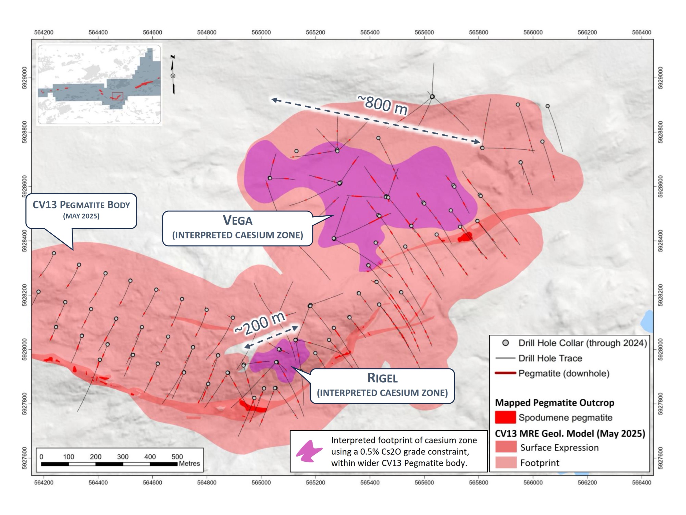 - Caesium within the Vega and Rigel zones will be included in the next Mineral Resource update for the Project, targeted for Q3-2025. Interpreted sizes of the Vega and Rigel zones are significant – footprints of ~800 m x 250 m (Vega) and ~200 m x 100 m (Rigel).