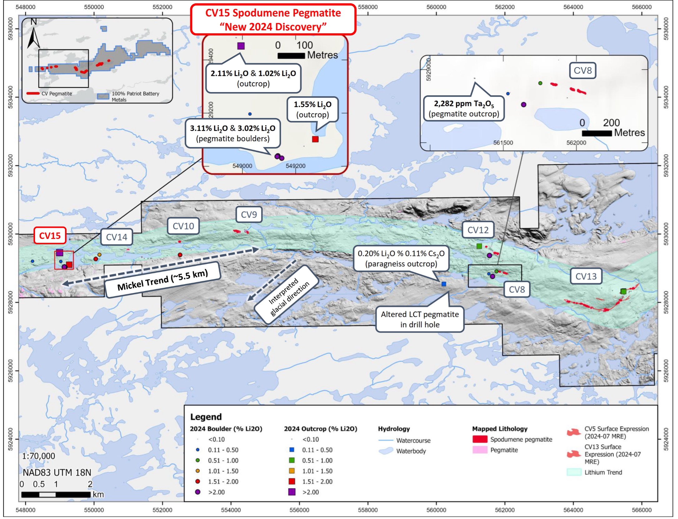 The 2024 program resulted in the discovery of a significant new spodumene pegmatite cluster at surface, named CV15, with outcrop grab sample assays including 2.11% Li2O, 1.55% Li2O, and 1.02% Li2O. Additionally, grab sample assays from nearby boulders returned grades of 3.10% Li2O and3.02% Li2O. The CV15 discovery is situated approximately 1.9 km southwest and along geological trend from CV14, and collectively now forms part of a larger ~5.5 km long prospective trend extending from the CV9 spodumene pegmatite cluster to CV15, now referred to as the Mickel Trend (Figure 1 and Figure 2).