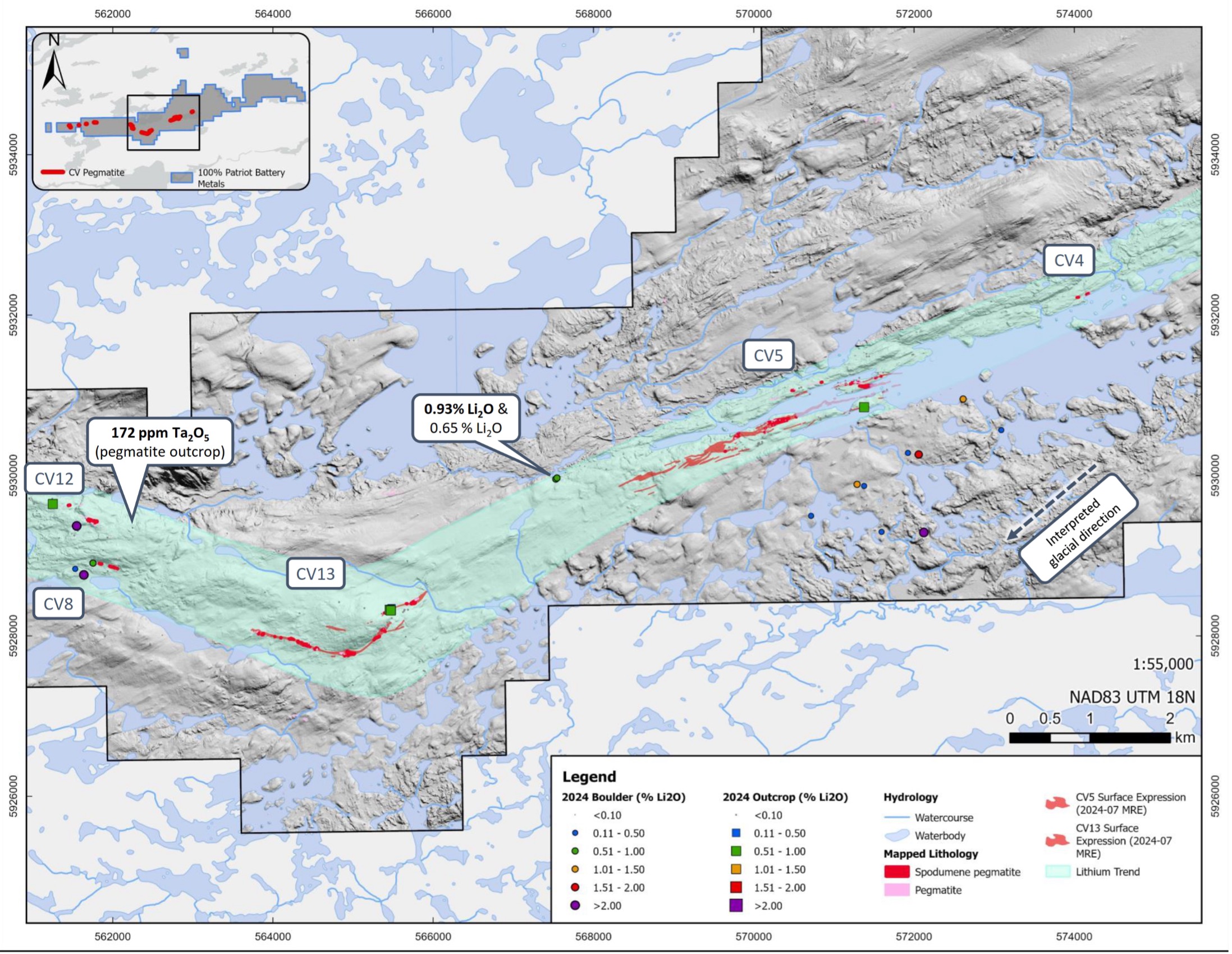 Darren L. Smith, Patriot Executive and Vice President of Exploration, comments: “The 2024 surface campaign at Shaakichiuwaanaan has delivered significant results which continue to demonstrate that we have still only scratched the surface in terms of the Property’s broader exploration potential. The discovery of another new spodumene pegmatite occurrence at CV15 – along the prospective Mickel Trend, which encompasses CV9, CV10, CV14, and CV15 – represents another exciting opportunity for the Company.”