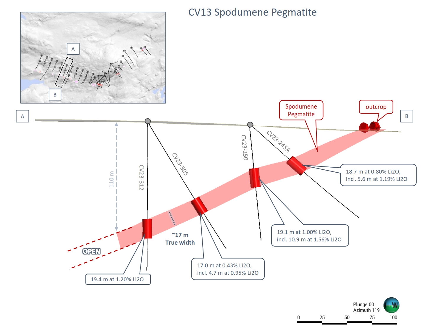 The drilling continues to trace spodumene pegmatite at CV13 to the west-northwest along geological trend and remains open along strike and downdip in this area. Results remain to be reported for twelve (12) drill holes, covering approximately 300 m of strike, over the far portions of this western limb. The mineralized pegmatite in this area has a shallow northeasterly dip resulting in pegmatite being traced down dip for over 250 m with minimal drilling, while still only being approximately 100 m vertical depth below surface – see geological cross-section in Figure 2, which includes drill holes CV23-305 and 312 as reported herein.