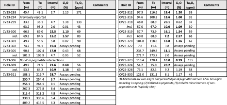 - 22.5 m at 1.10% Li2O, including 15.2 m at 1.57% Li2O (CV23-300).