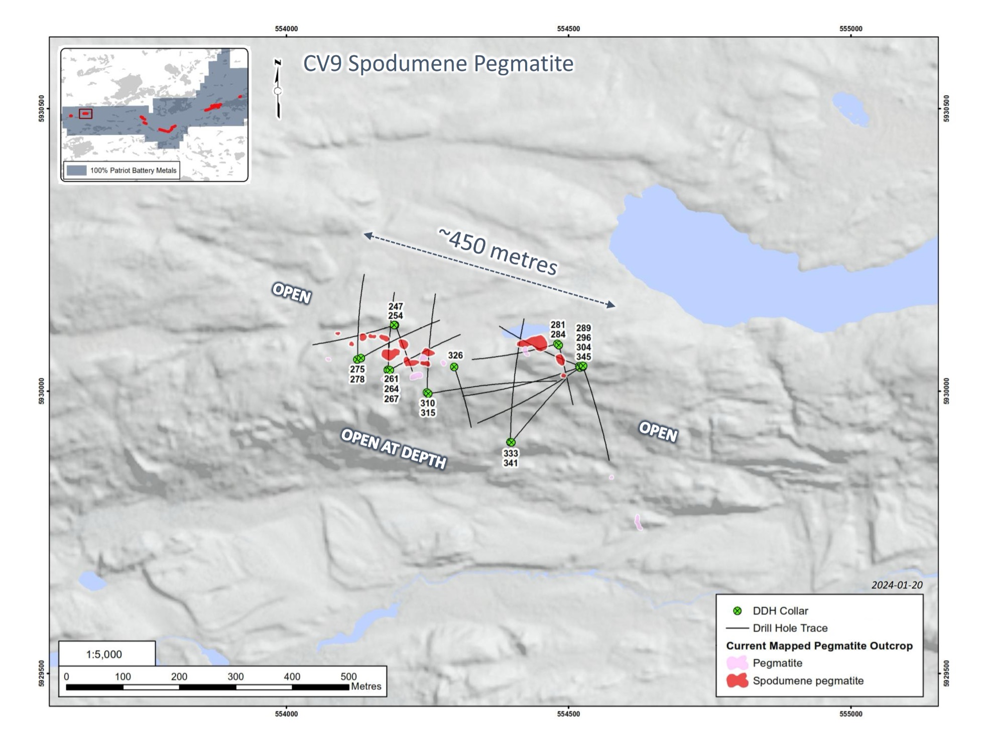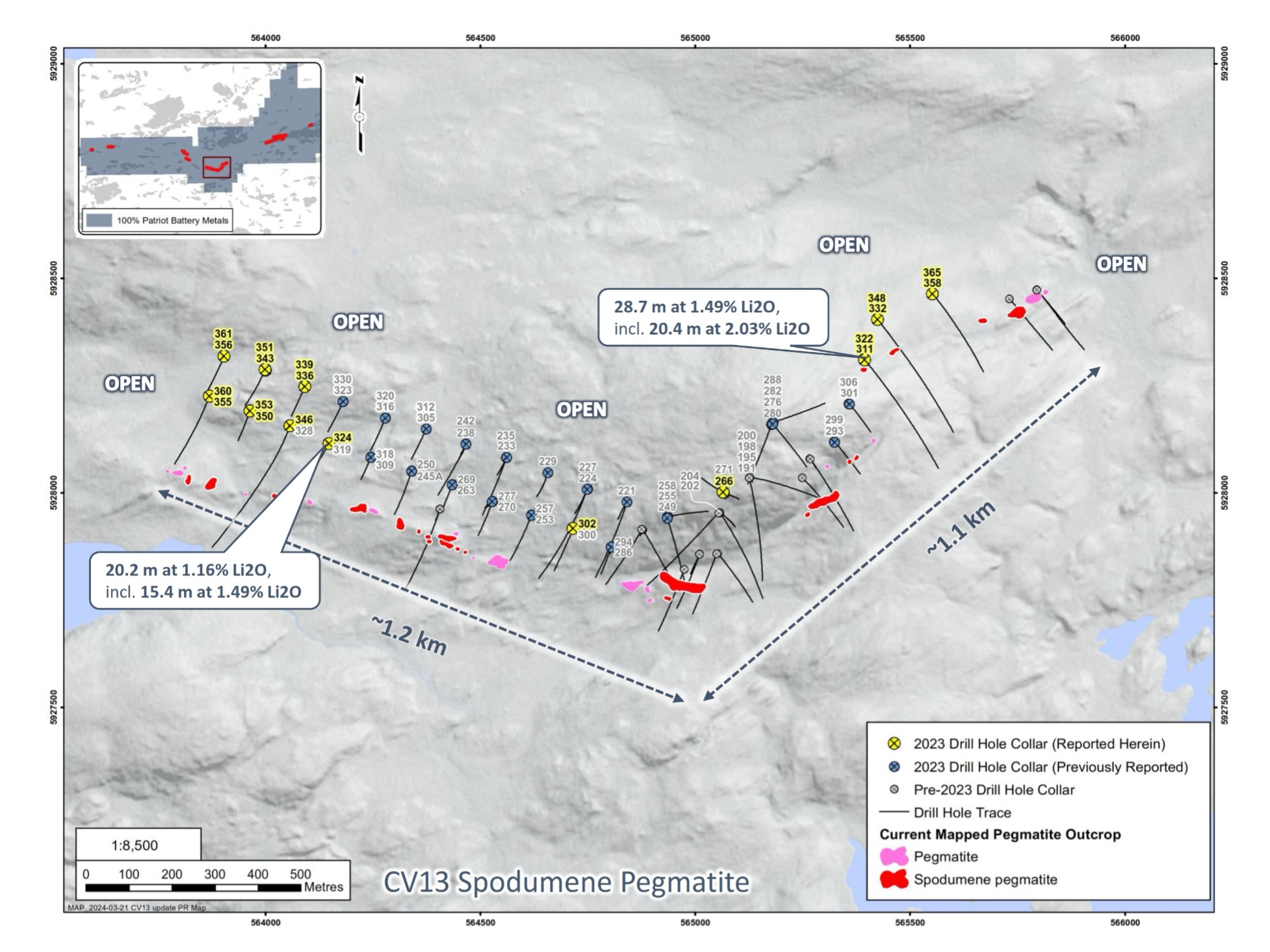 Patriot Battery Metals Inc. (the “Company” or “Patriot”) (TSX: PMET) (ASX: PMT) (OTCQX: PMETF) (FSE: R9GA) is pleased to announce the remaining core assay results for drill holes completed in September to November 2023 at the CV13 and CV9 spodumene pegmatites. The Corvette Property (the “Property” or “Project”), wholly owned by the Company, is located in the Eeyou Istchee James Bay region of Quebec. The CV13 and CV9 spodumene pegmatites are located approximately 3 km west-southwest and 14 km west of the CV5 Spodumene Pegmatite, respectively, which hosts a maiden mineral resource estimate of 109.2 Mt at 1.42% Li2O inferred1 and is situated approximately 13.5 km south of the regional and all‑weather Trans-Taiga Road and powerline infrastructure.