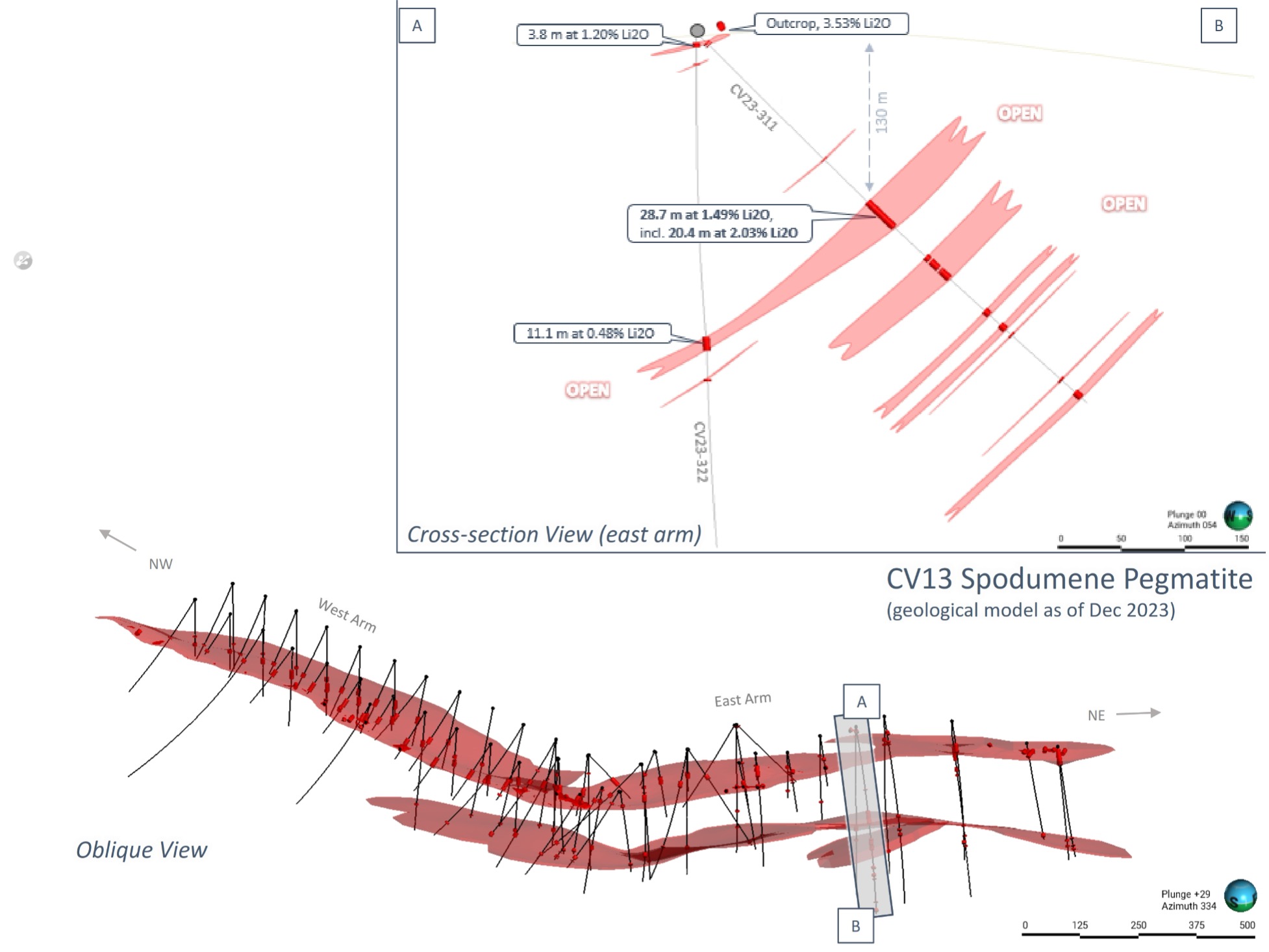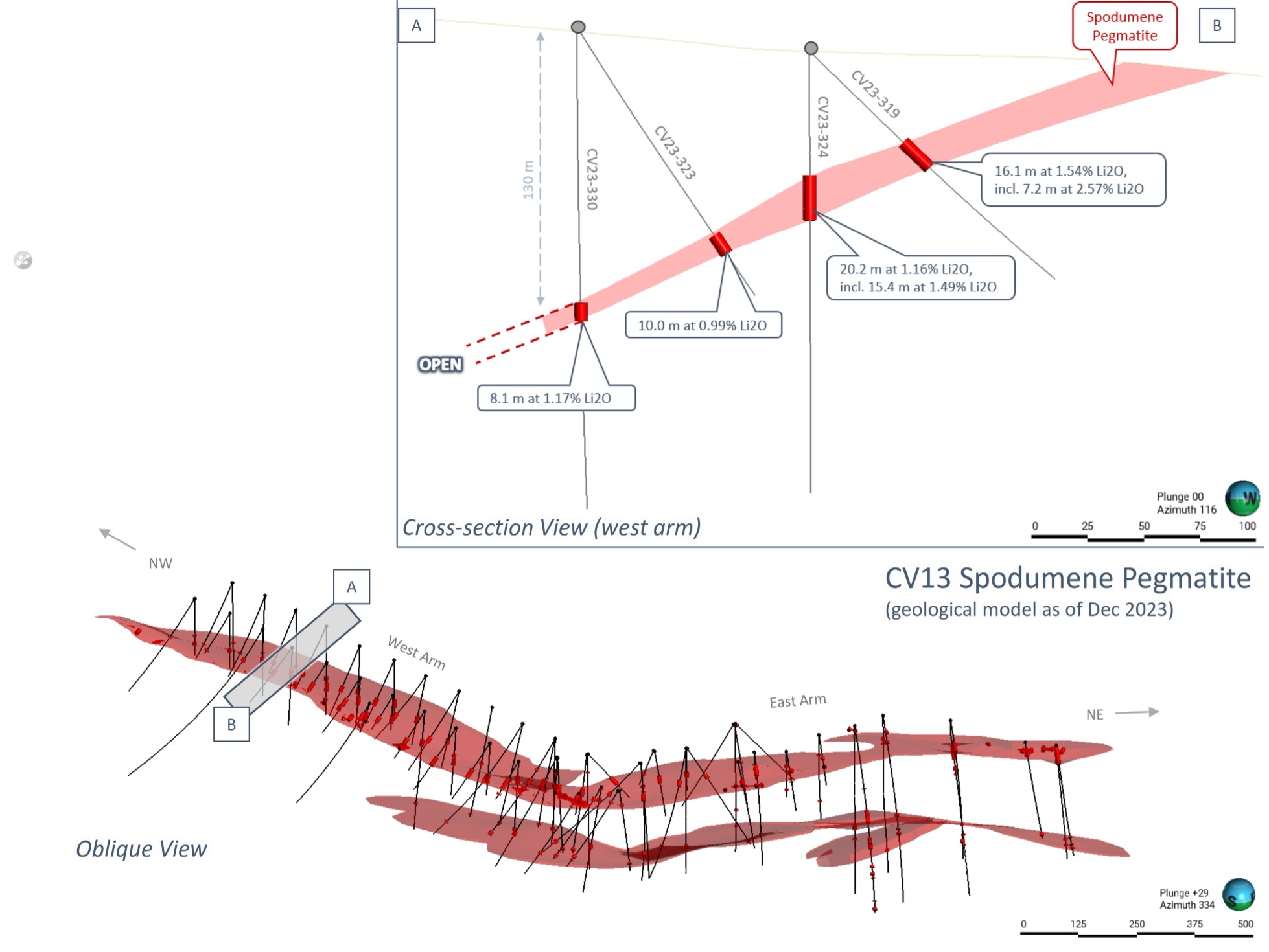 - Through 2023, the CV13 Spodumene Pegmatite has been traced by drilling over an approximate 2.3 km strike length and remains open along strike at both ends and to depth.
