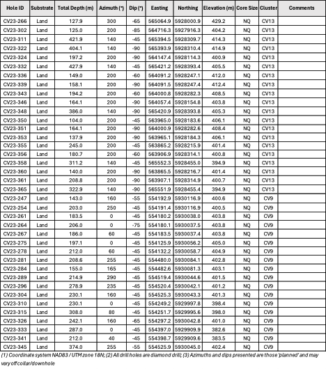 - Core assay results are reported herein for the remaining 20 drill holes completed in 2023 at CV13.