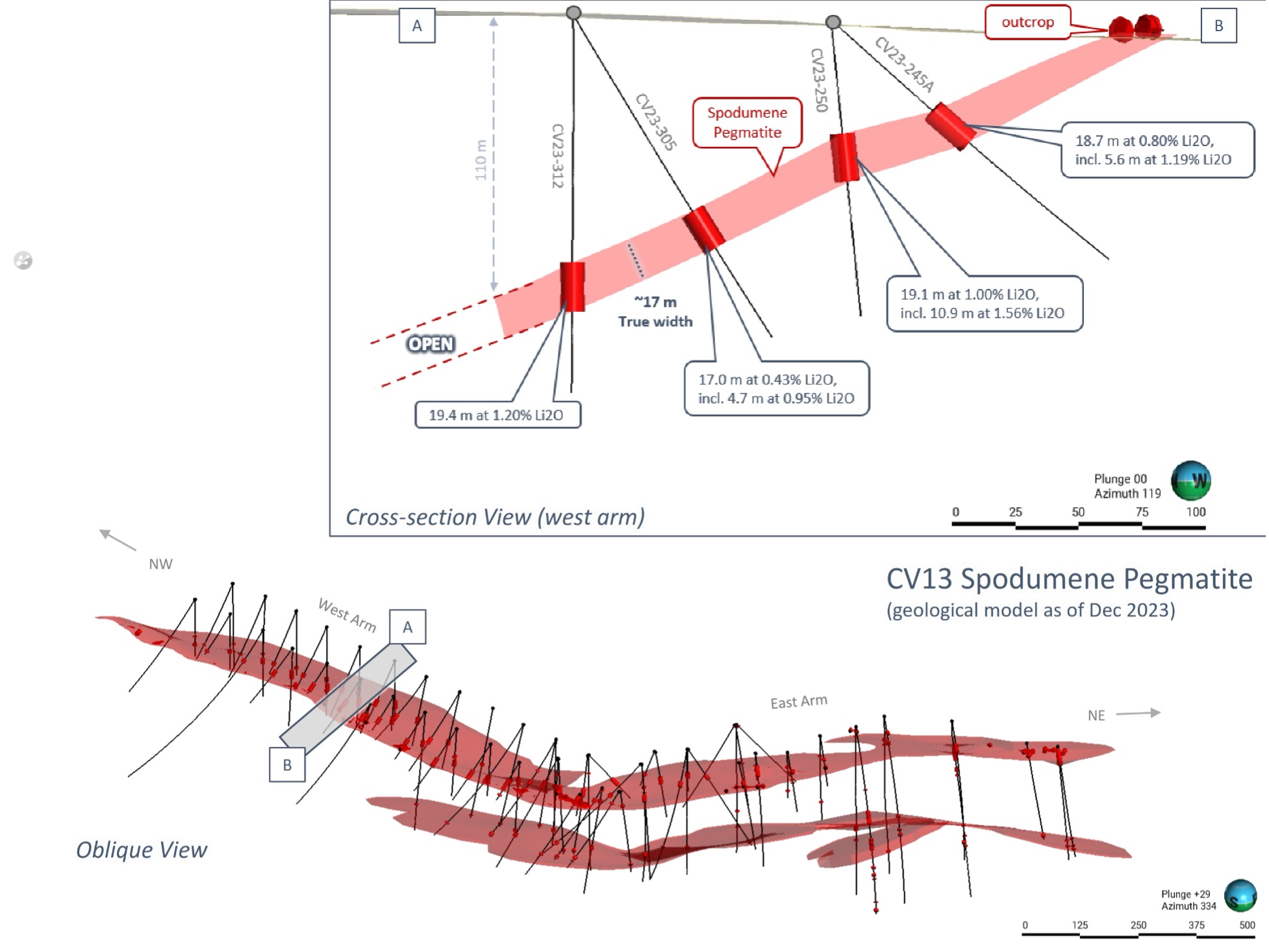 Figure 4: Geological model of the CV13 Spodumene Pegmatite (as of end 2023), including cross-section along the pegmatite’s western arm. Core assay results for drill holes are previously reported.