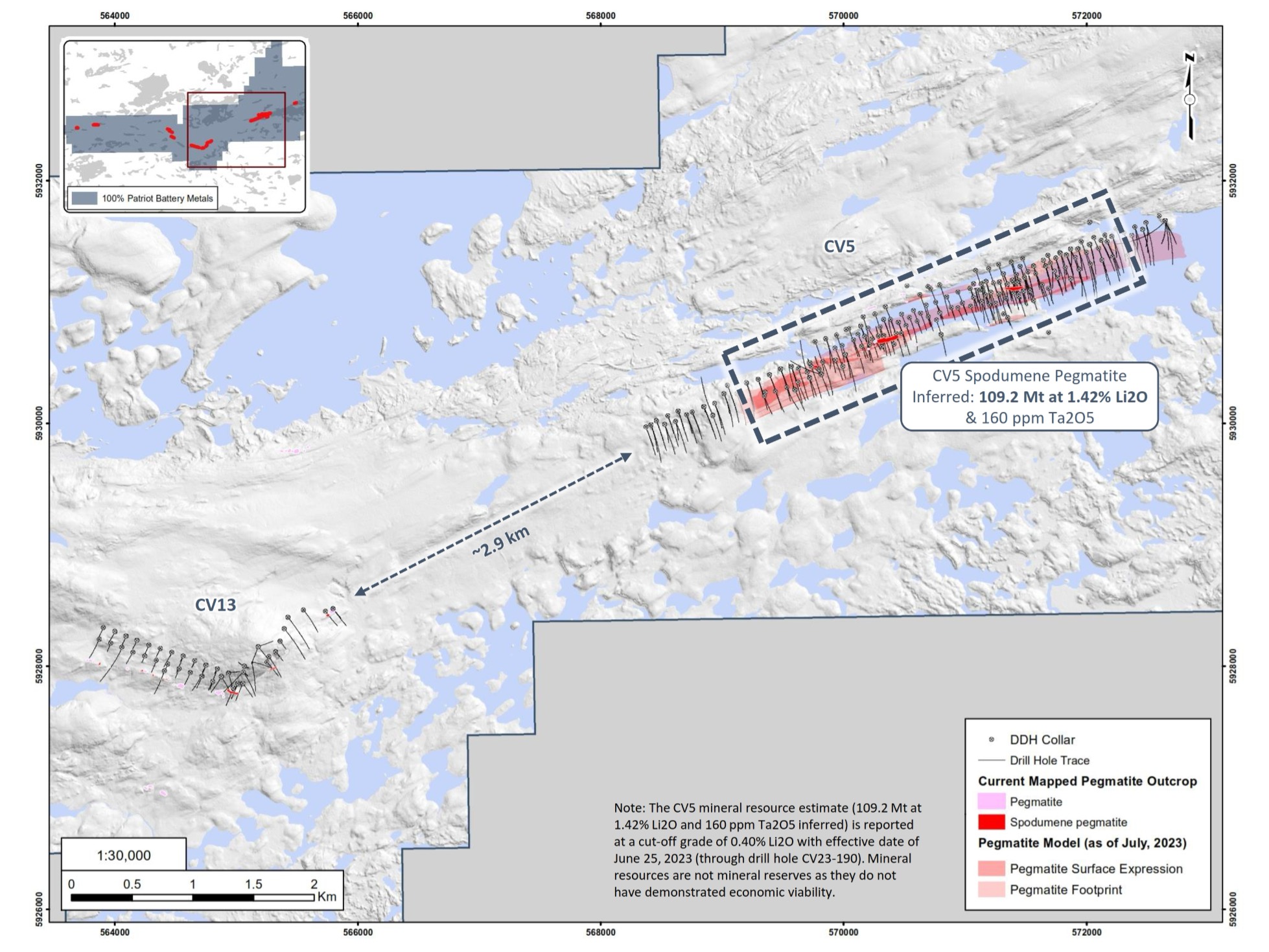 1 The CV5 mineral resource estimate (109.2 Mt at 1.42% Li2O and 160 ppm Ta2O5 inferred) is reported at a cut-off grade of 0.40% Li2O with effective date of June 25, 2023 (through drill hole CV23-190). Mineral resources are not mineral reserves as they do not have demonstrated economic viability.
