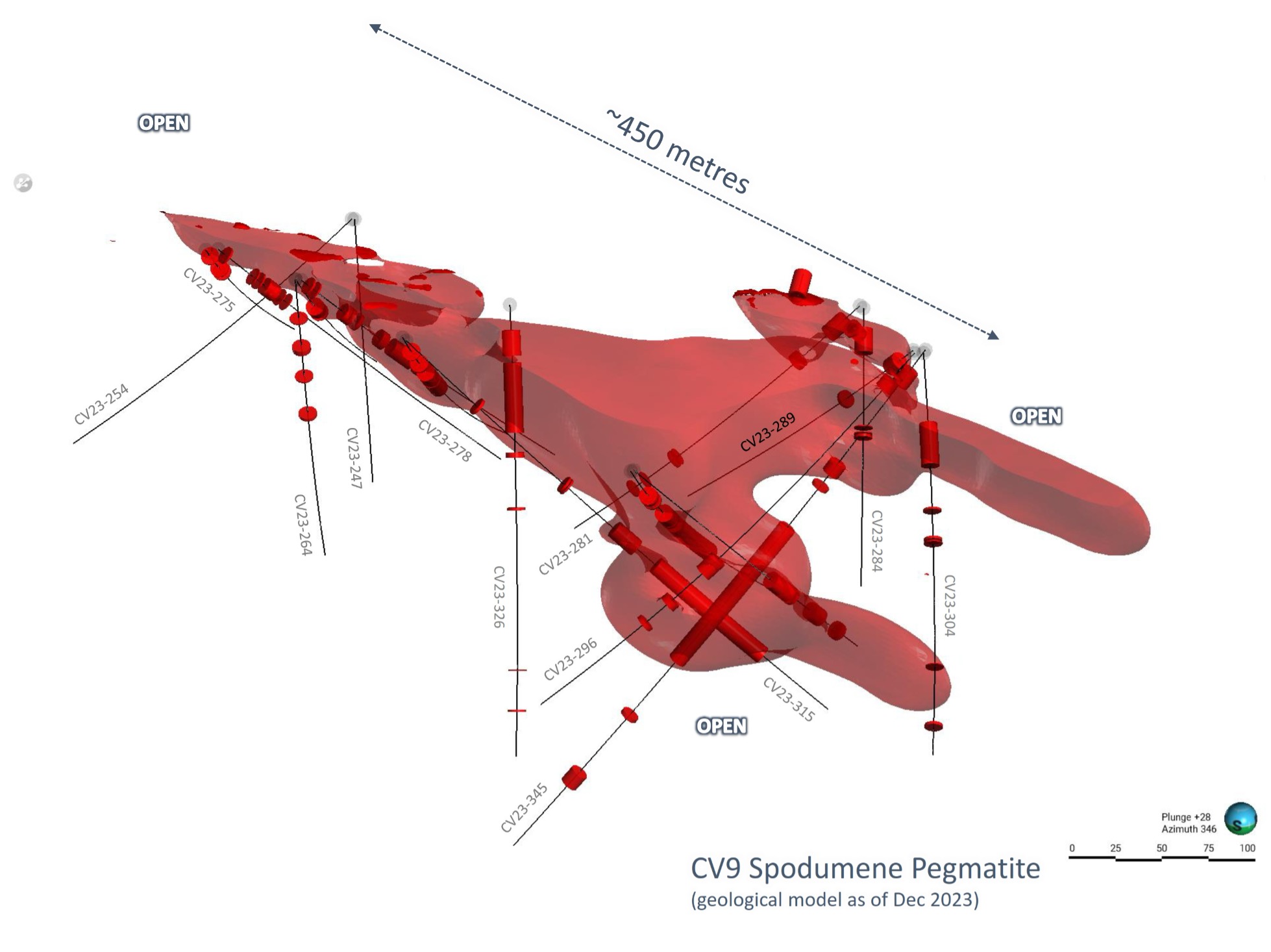 - The CV9 Pegmatite remains open along strike and at depth, with true widths of <5 m to 80+ m interpreted through drilling, which suggests strong tonnage potential.