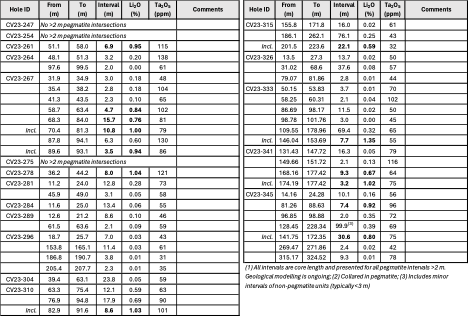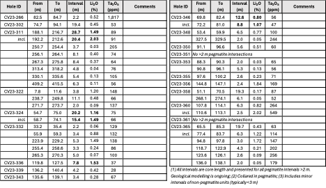 - 28.7 m at 1.49% Li2O, including 20.4 m at 2.03% Li2O (CV23-311).