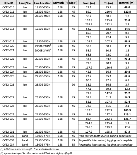 In addition, the working geological model continues to indicate that the pegmatite body is thickening at depth, as is evidenced by drill holes CV22-016, 019, 031, and 028, which tested the down-dip extension of drill holes CV22‑015, 018, 025, and 027, respectively, and returned significantly wider intercepts. Orientation of drill holes along with logged pegmatite intercepts are presented in Table 1. The location of drill holes completed to date are presented in Figure 1.