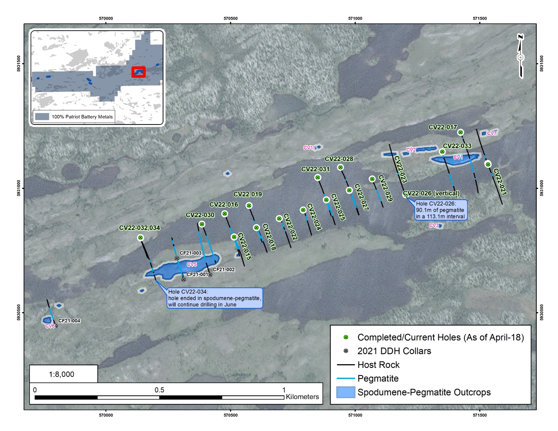 The aggressive 2022 drill campaign is being completed as a direct follow-up to the strong lithium-tantalum mineralization encountered in the first four (4) drill holes to test the CV5-6 pegmatite this past fall. Drill intercept highlights include 155.1 m at 0.94% Li2O and 117 ppm Ta2O5 (CF21-002), and 58.1 m at 1.25% Li2O and 194 ppm Ta2O5 (CF21-003) (see news releases dated January 27th and February 3rd, 2022).